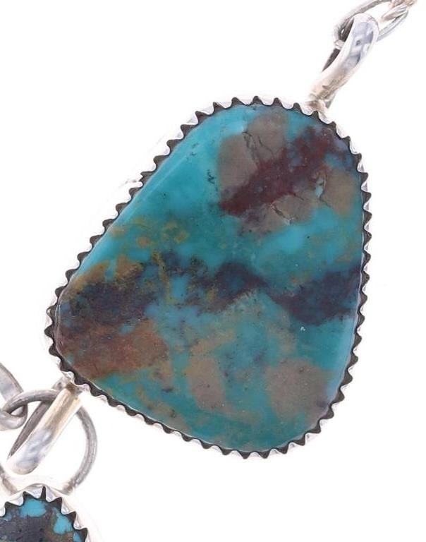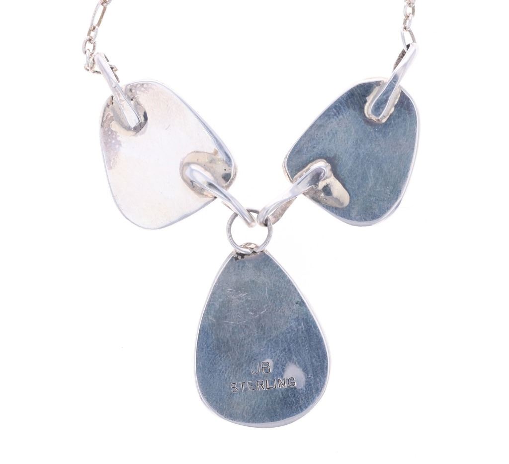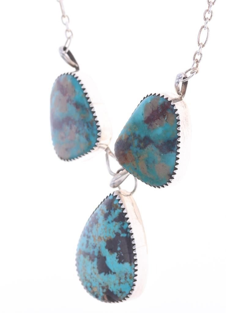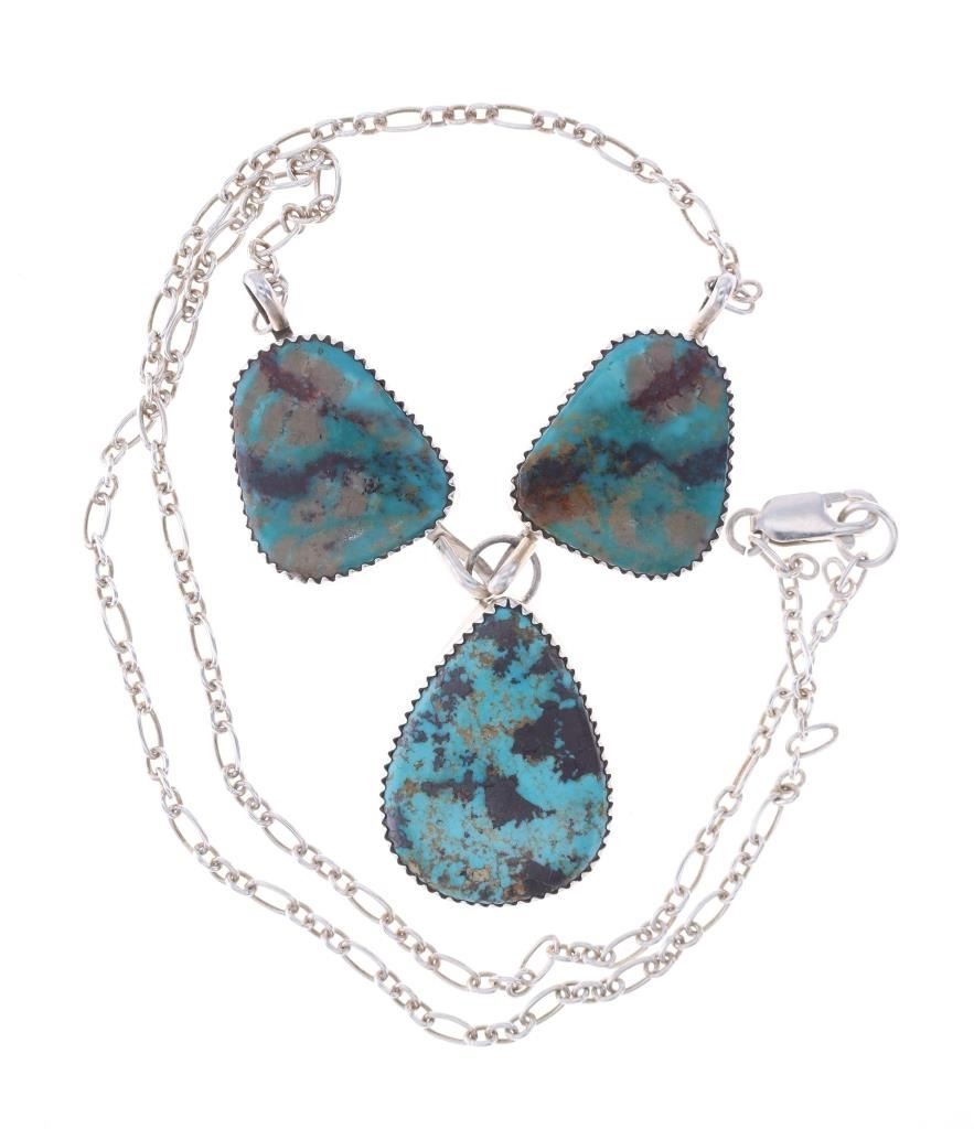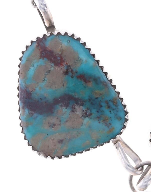 Featured in this lot is this Sunnyside Turquoise necklace from Navajo artist Jennifer Begay. The necklace shows a wonderfully and professionally crafted sterling silver and turquoise construction. The necklace shows a cluster link set of pendants that shows Sunnyside Turquoise cabochon set into them with a sterling silver link chain. The central pendant is marked 'JB' and 'Sterling' on the back of the pendant. The condition of this necklace shows secure stones of turquoise and a fine link chain and shows no obvious signs of damage. The measurements of this necklace from clasp to clasp is 19 1/4" and the cluster of pendants measures 1 7/8" x 2 7/8". The collective weight of this necklace is 23.5g.
