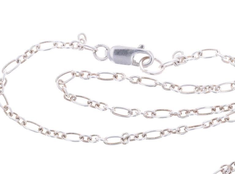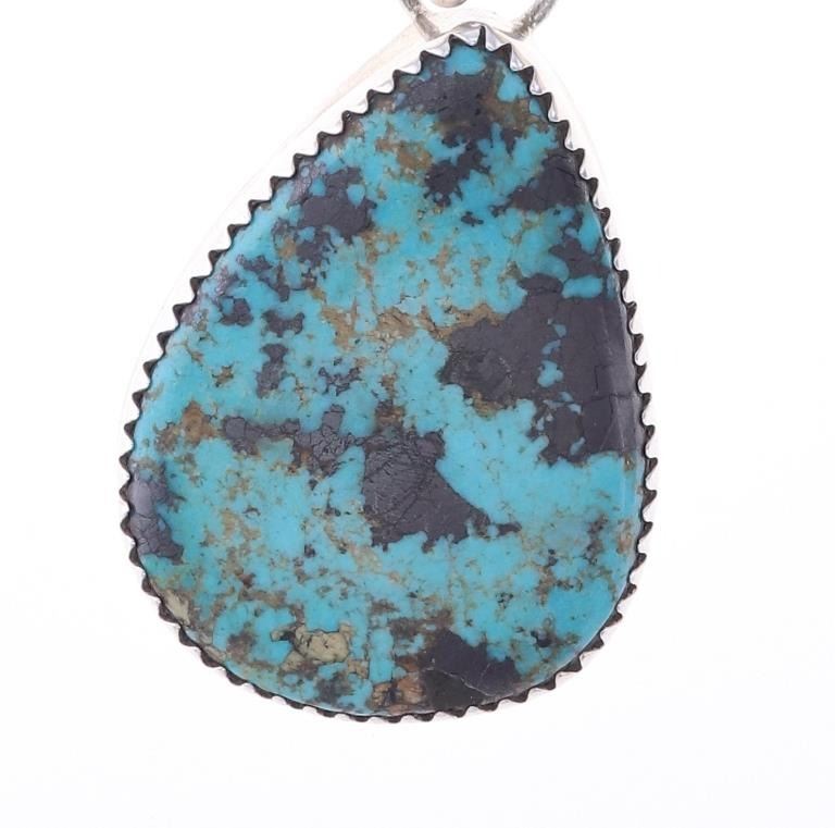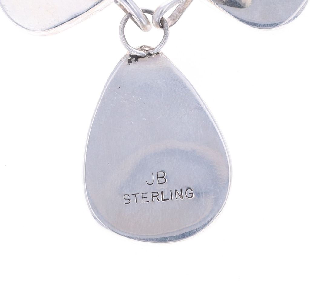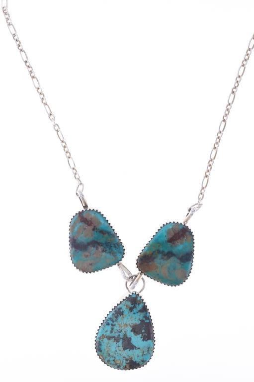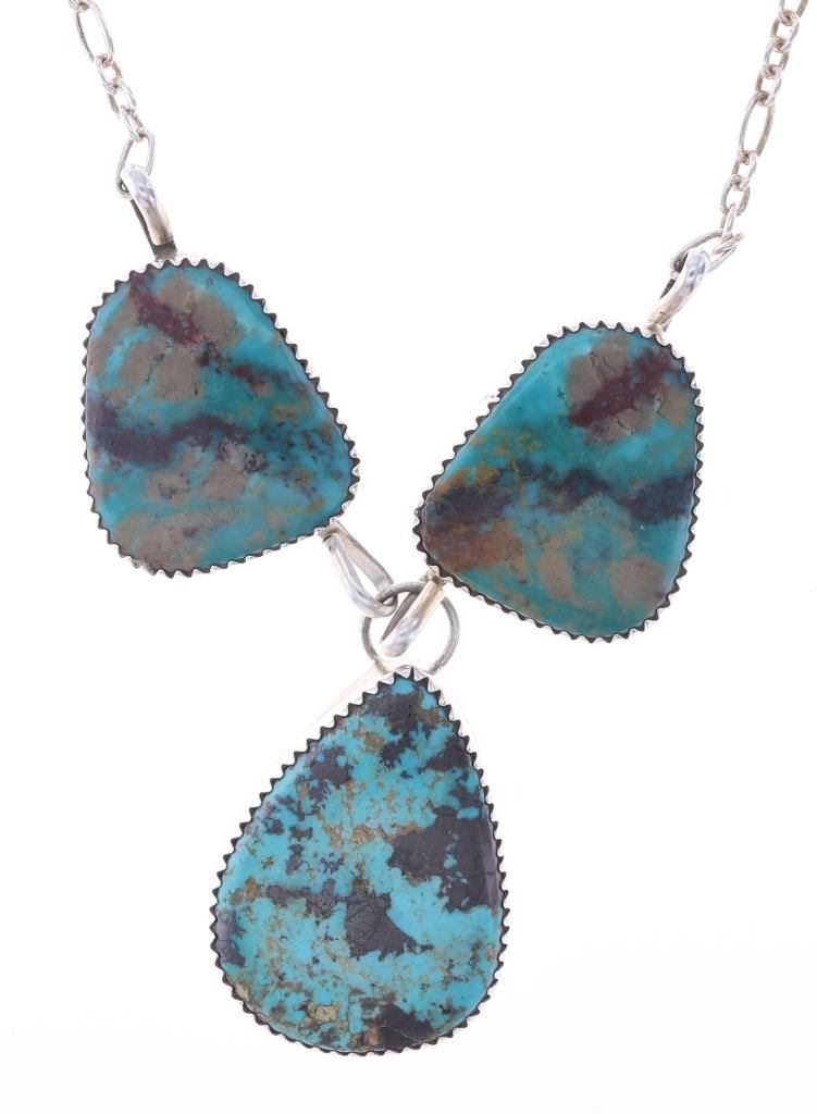 Featured in this lot is this Sunnyside Turquoise necklace from Navajo artist Jennifer Begay. The necklace shows a wonderfully and professionally crafted sterling silver and turquoise construction. The necklace shows a cluster link set of pendants that shows Sunnyside Turquoise cabochon set into them with a sterling silver link chain. The central pendant is marked 'JB' and 'Sterling' on the back of the pendant. The condition of this necklace shows secure stones of turquoise and a fine link chain and shows no obvious signs of damage. The measurements of this necklace from clasp to clasp is 19 1/4" and the cluster of pendants measures 1 7/8" x 2 7/8". The collective weight of this necklace is 23.5g.