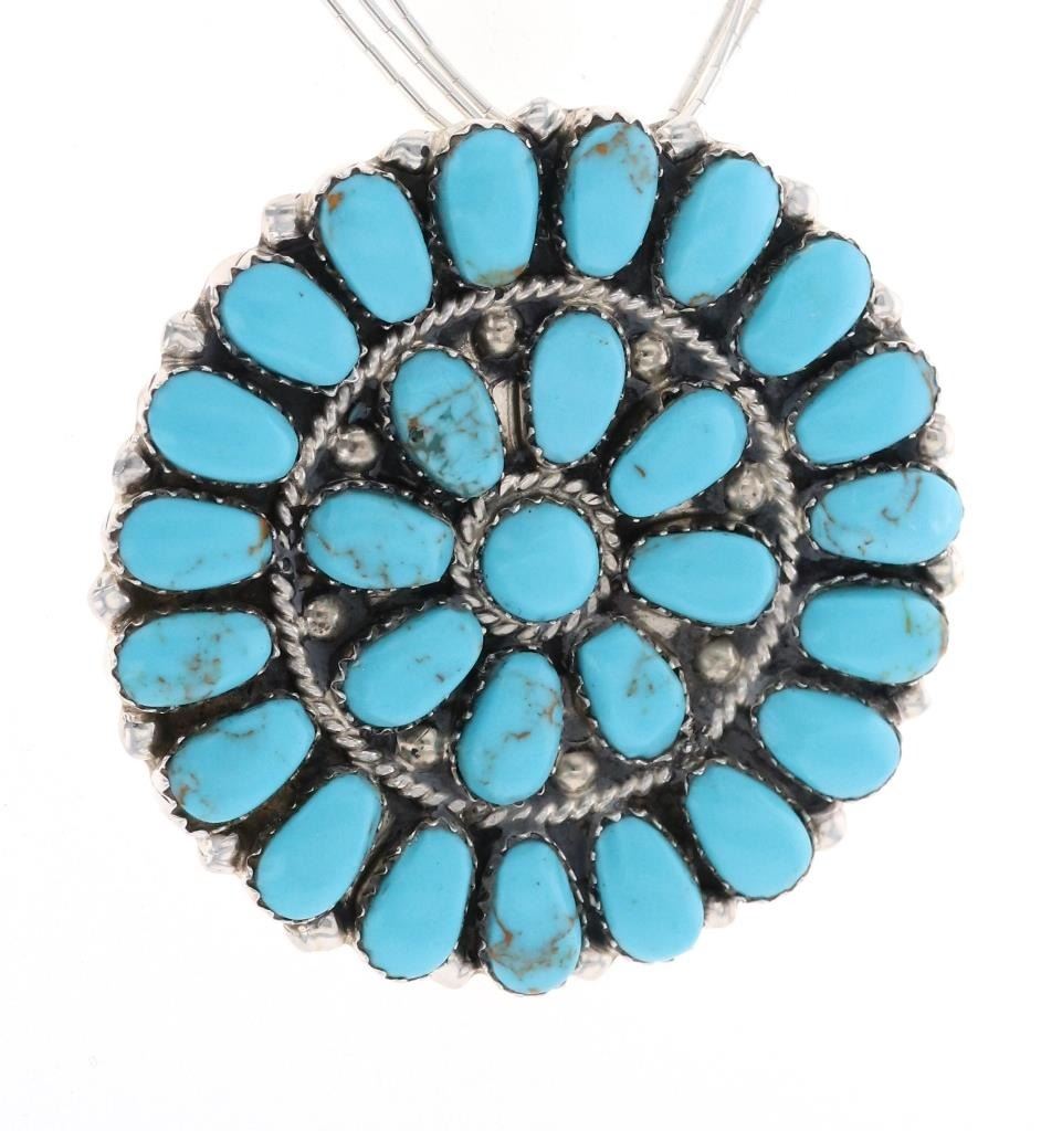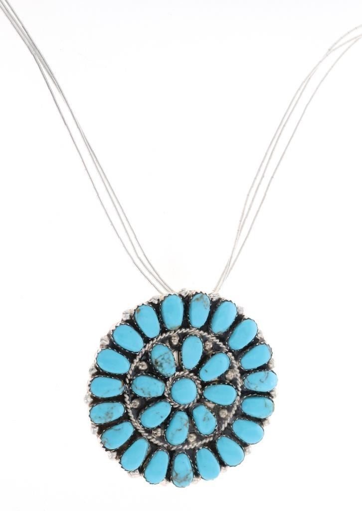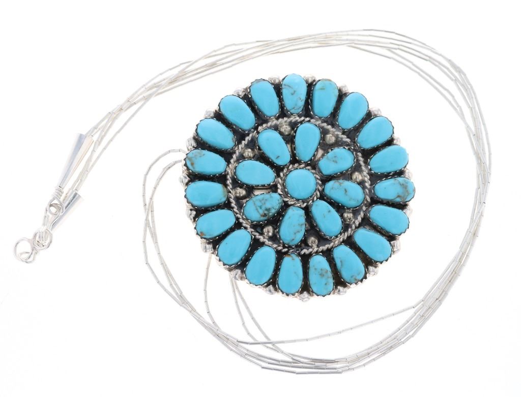 Featured in this lot is this sterling silver and turquoise necklace from Navajo artists Jerry and Wilma Begay. The necklace features a wonderfully and professionally crafted sterling silver construction that shows a triple strand necklace chain that features a total of 28 pear and round cut cripple creek turquoise cabochon set into the pendant face. The pendant is marked 'JW' and 'Sterling' stamp next to the hallmark and is marked on the aglets 'sterling'. The condition of this necklace is good with no obvious signs of damage and shows good overall condition. The measurements of this necklace from clasp to clasp is 20 1/2" and the pendant measures 2" x 2" x 1/4". The collective weight of this necklace is 22.4g.