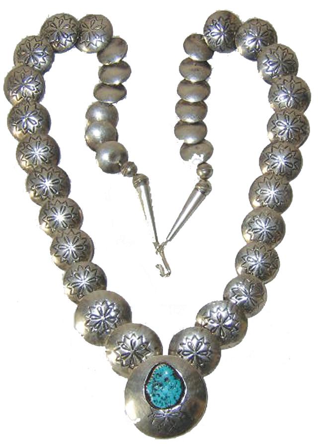 Circa 1980s, Stamped sterling flat bead necklace with a silver and turquoise pendant - hallmarked Y (Johnson Yazzie). 24"