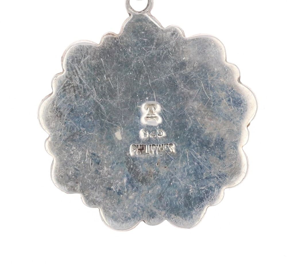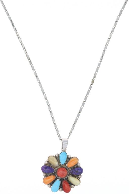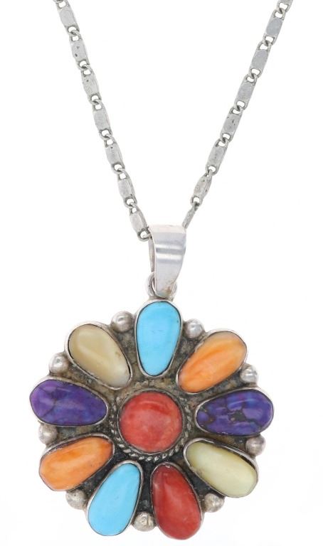 Featured in this lot is this sterling silver multistone necklace from Navajo artist Joe Tom. The necklace features a wonderfully and professionally crafted sterling silver construction that shows a pendant with turquoise, agate, red branch coral, red spiny oyster, and mother of pearl cabochon set into the face of the pendant. The necklace is marked 'T' for Joe Tom and '.925' along with a 'sterling' stamp underneath the hallmark. The condition of this necklace is good with no obvious signs of damage and shows good overall condition. The measurements of this necklace from clasp to clasp is 18 1/2" and the pendant measures 1 1/2" x 1 1/4". The collective weight of this necklace is 9.2g.