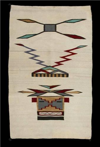 Navajo Kachina Rug. 93" x 50", circa 1890-1905. Possibly the largest kachina rug in existence. Depicts Nuv-ak (The Snow Kachina) under storm cloud, rain and lightning bolts. Woven with carpet yarn. Ivory field is of silky churro wool. Excellent condition.