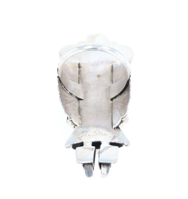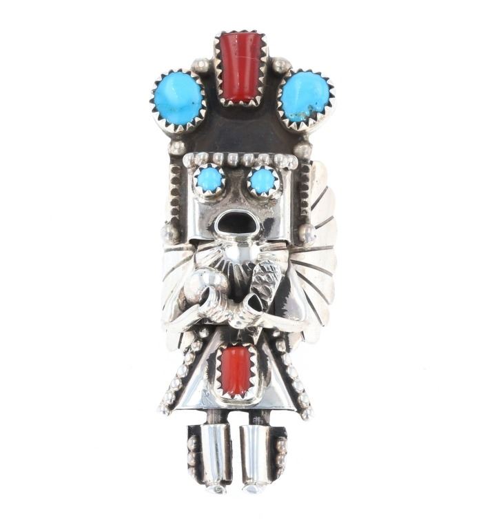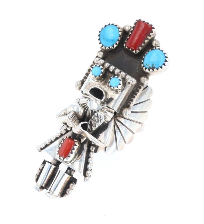 Featured in this lot is this sterling silver and Kingman turquoise handmade ring from Navajo artist Dorris Smallcanyon. The ring features a beautifully and professionally crafted sterling silver Kachina Man with six total rough cut Kingman turquoise and red branch coral cabochons adorning the design in the headdress and the eyes of the Kachina Man. The artist’s hallmark can be seen on the underside of the ring. The condition of this ring is good, with no obvious signs of damage. The measurements of this ring are 1 1/8" x 2 1/8" x 7/8" and the ring size is US 8. The collective weight of this ring is 14.1g.
