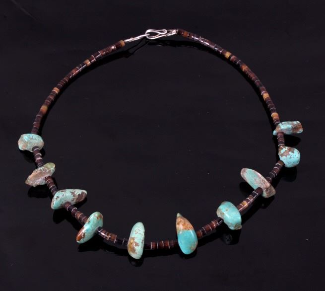For your bidding pleasure is a Navajo Native American Indian necklace, composed of Kings Manassa turquoise and Heishe shell and dating to early 1900. This necklace is composed of ten beautiful turquoise nuggets spaced with rich brown Heishe shells. This necklace is in great condition and comes together with a silver clasp. When the necklace is unclasped it measures 16" long. Truly a wonderful and rare pre-pawn Navajo piece.