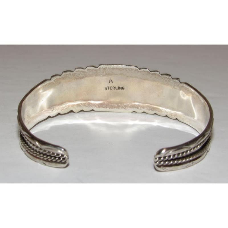 For your consideration is this stunningl example of Native American art by the collectible Navajo artist Annie Chapo. This fab bracelet features a beautiful hand etched traditional design in sterling silver accented with Kingman turquoise cluster design. The bracelet is about 1" wide on the front at the widest point and the inside circumference is about 6 1/2"-7" including gap. The gap is about 1 1/4". The cuff can be slightly carefully adjusted. Stunning example of wearable Native American art to add to any collection!