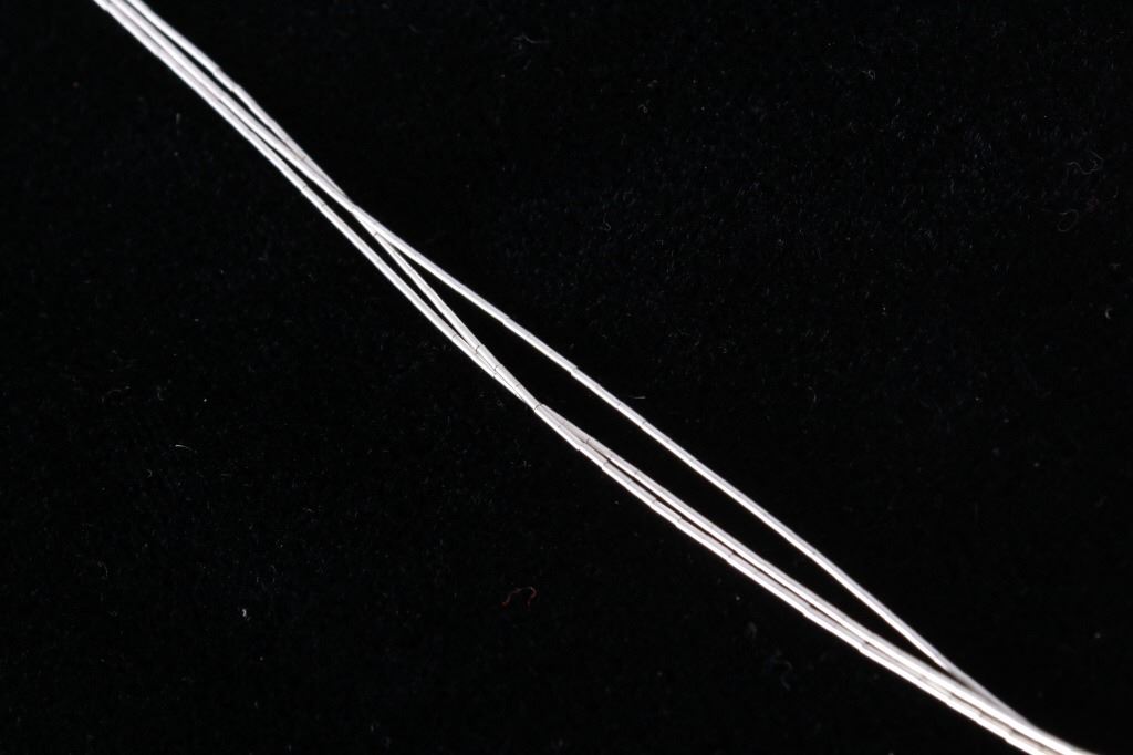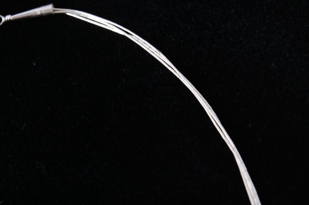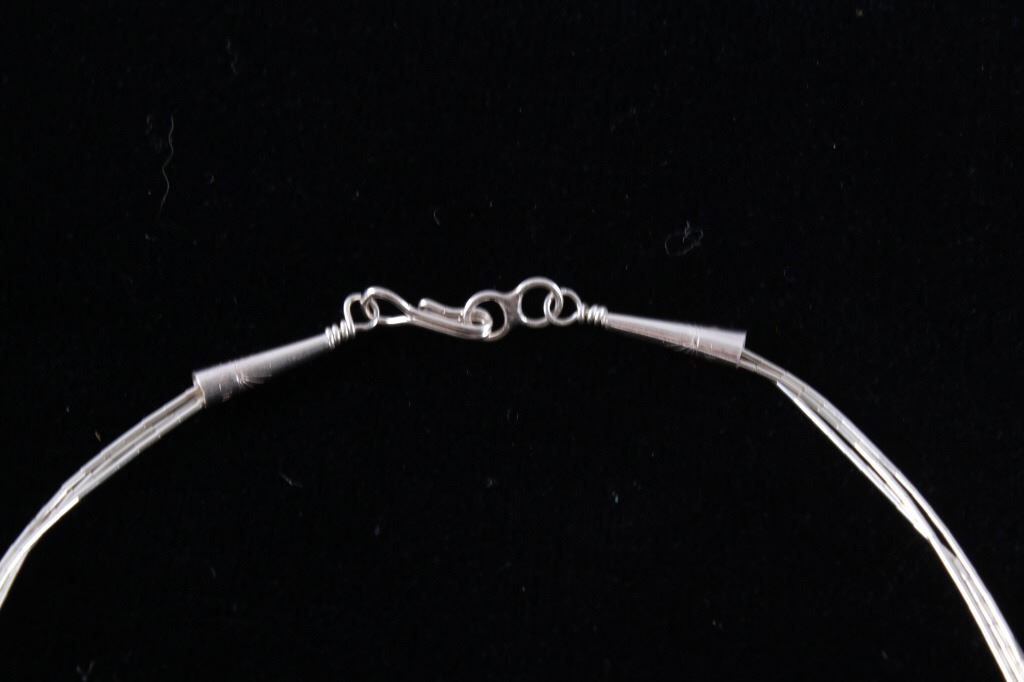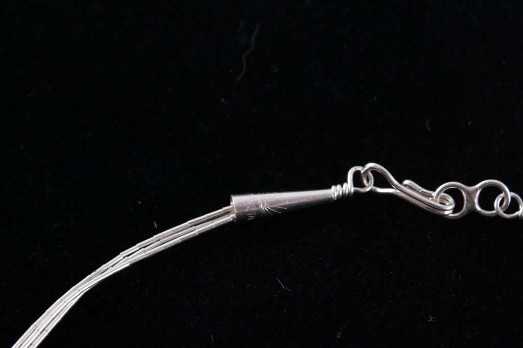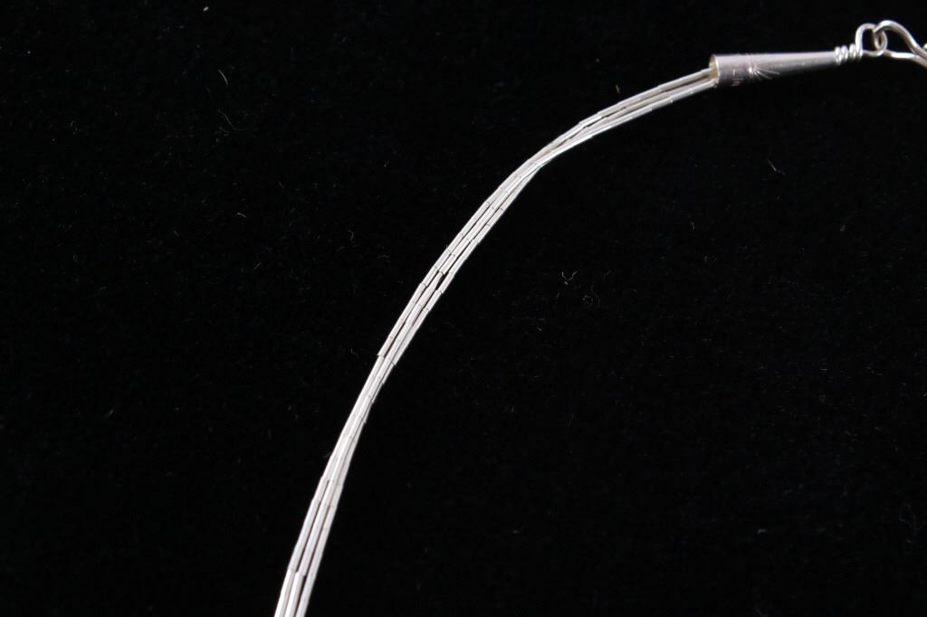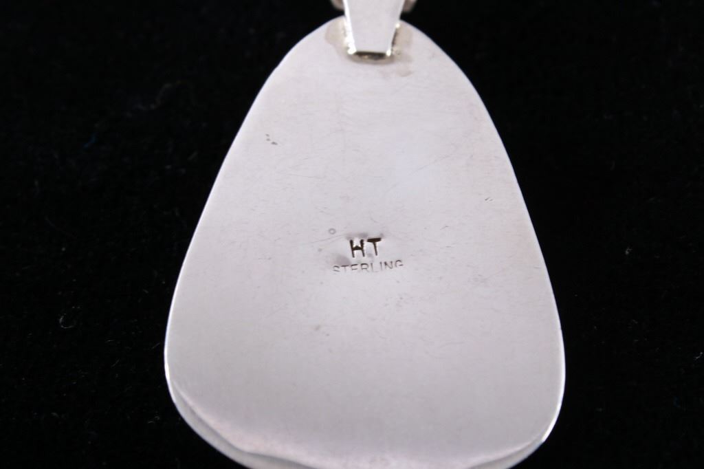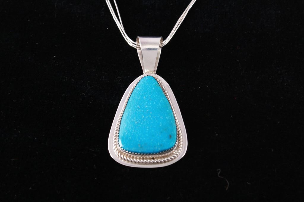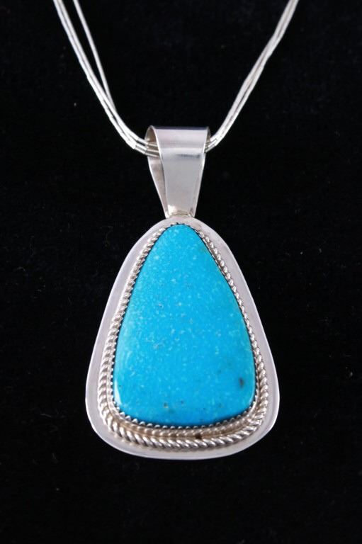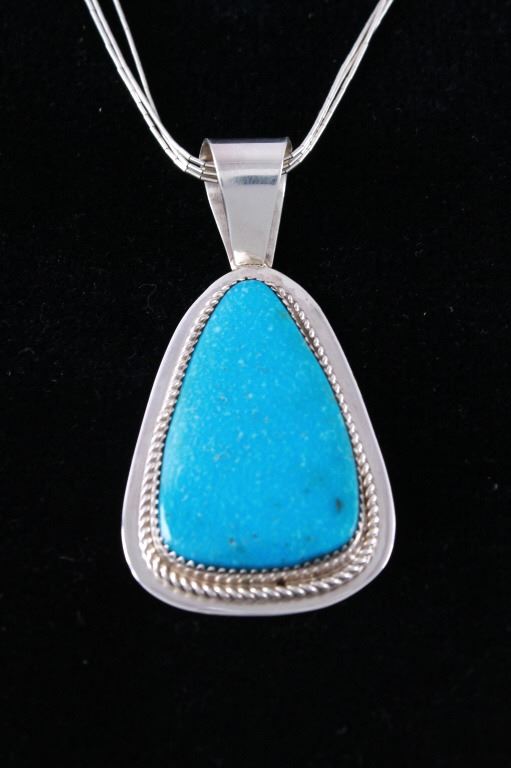 The lot features a beautiful Kingman Turquoise necklace set in sterling silver on a liquid silver strand all from master Navajo silversmith Herbert Tsosie. The pendant is signed "HT Sterling" and is comprised of sterling silver and set with a large polished cabochon of natural turquoise from the Kingman Turquoise Mine. The pendant is paired with an original Navajo liquid sterling silver triple strand. Good condition. Necklace measures 20"L and the pendant is 2 5/8" by 1 3/8".
