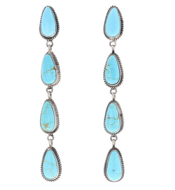 This is an excellent set of long four-stone dangling earrings in sterling silver with Kingman Turquoise from Navajo silversmith Elouise Kee. The set is signed "Elouise Kee STERLING" and is constructed of sterling silver with a rope silver border showing a four setting dangling post back design. Four stone earrings from authentic Navajo artist are uncommon with this being a truly fantastic set showing eight polished cabochons of turquoise from the Kingman Turquoise Mine. The set is in good condition. Each measures 4.25"L. Total weight of 29.6 grams.