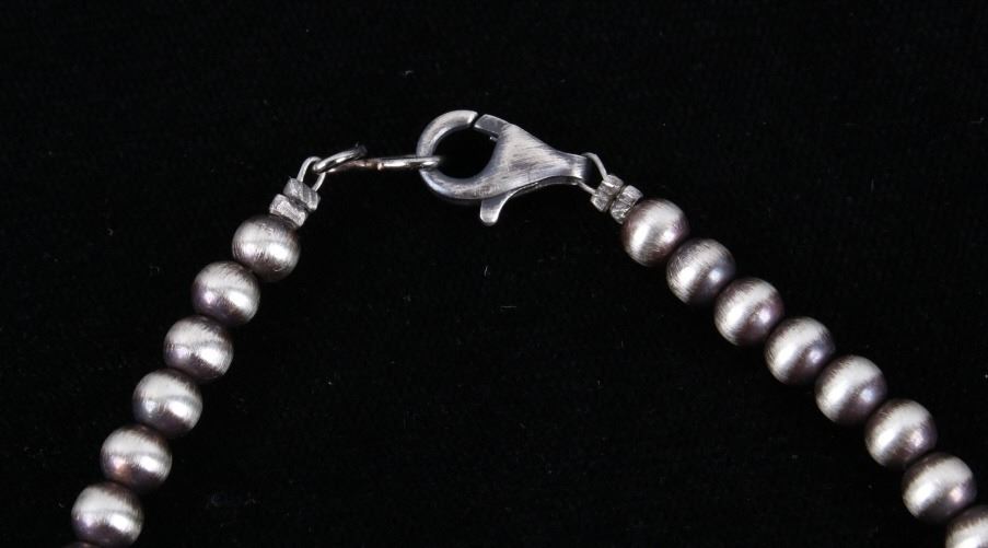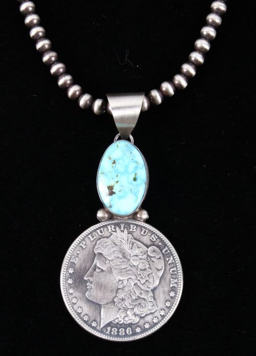 Included in this lot is a Navajo Native American Betta Lee Kingman turquoise Morgan silver dollar sterling silver necklace. This beautiful necklace is strung on a 4mm beaded strand that shows a dark patina between each bead. The pendant features a lovely Kingman turquoise gemstone in shadow box setting and sterling bead accents. Attached to the Kingman turquoise stone is a large Morgan silver dollar circa 1886. The coin shows a brilliant silver luster. The back of the pendant is stamped with the artists hallmark “B. Lee” and “Sterling”. The necklace measures 18” when unclasped.