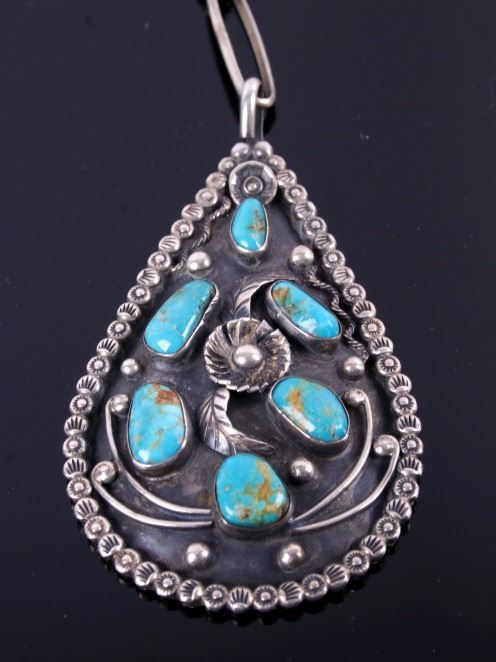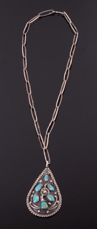 Included in this lot is a Navajo Native American Kingman Turquoise Necklace. This necklace features six Kingman turquoise cabochons. These cabochons are set on a silver pendant and are accompanied by silver floral details and silver beads. The necklace is composed of large silver links. Unclasped the necklace measures 27 1/4".