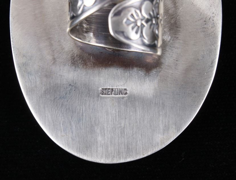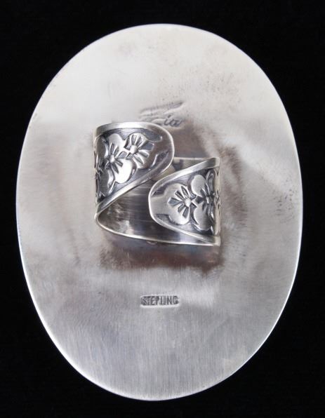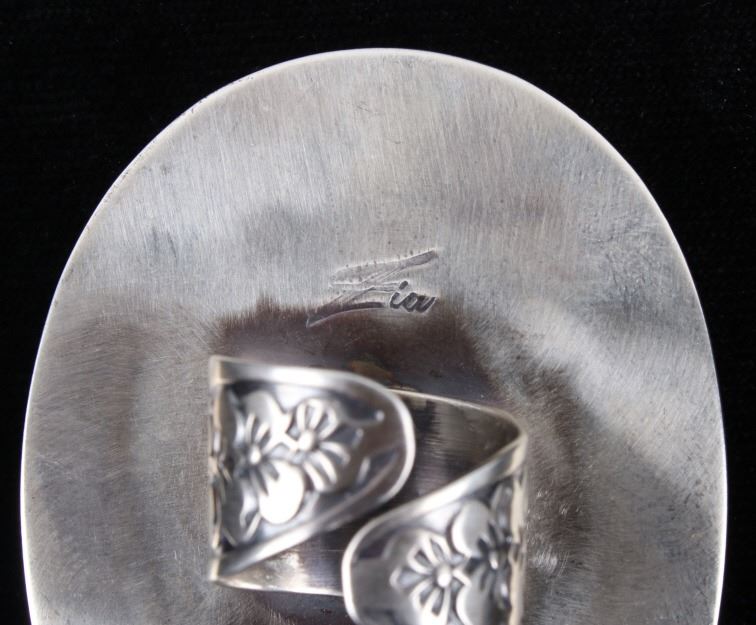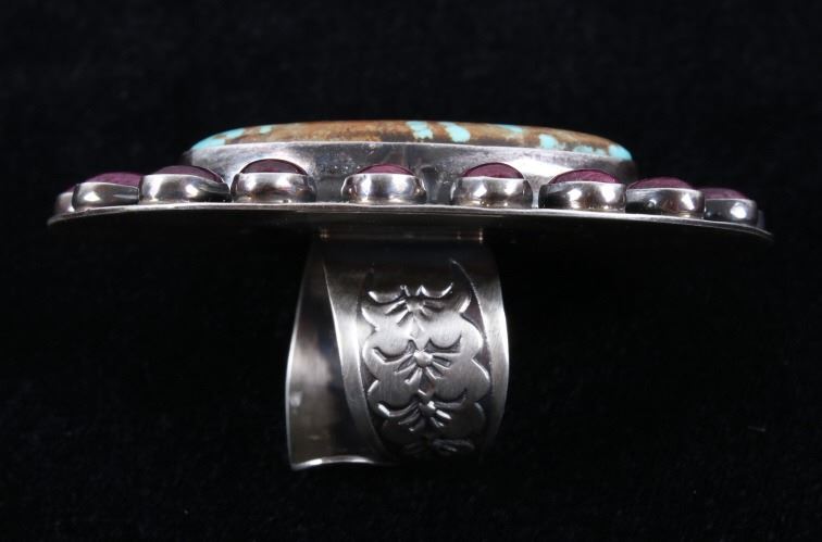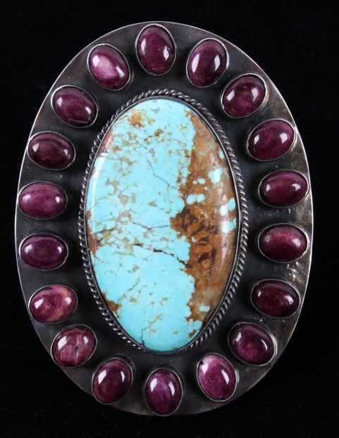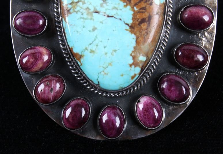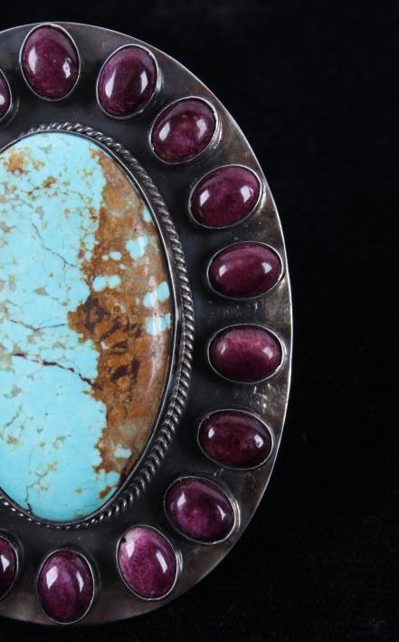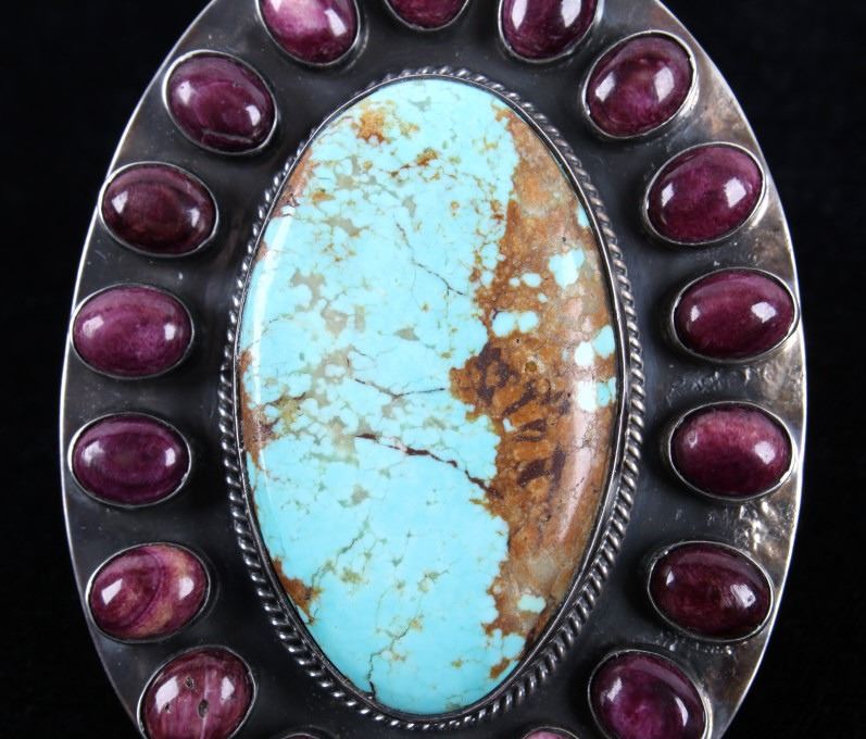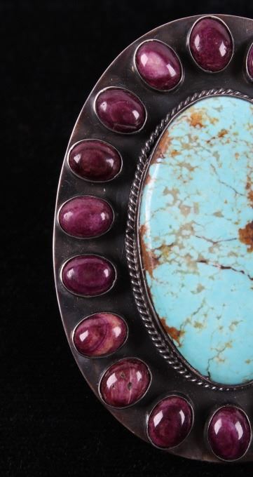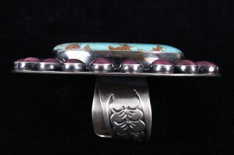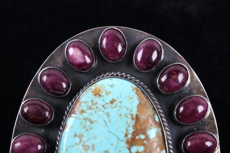 Included in this lot is a Navajo Native American Tony Yazzie Kingman turquoise and purple spiny oyster sterling silver ring. This absolutely stunning sterling silver ring features a large polished cabochon of Kingman turquoise expertly set in a shadow box display with sterling silver braided twist border. The large Kingman turquoise stone is surrounding by a fantastic display of 18 highly polished purple spiny oyster gemstones. The ring band is beautifully hand stamped. The underside of this ring is stamped with the maker Tony Yazzies hallmark and “Sterling”. The ring measures a US size 9 ¼.