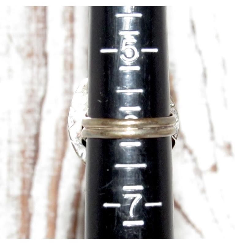 Navajo Sterling silver ring with a Kingman turquoise, twist wire and stamped scalloped border in size 6.. It measures approximately 7/8" long. It is Navajo hand made by Peggy Skeets. FREE SHIPPING ON ALL JEWELRY ORDERS WITHIN THE US! WE SHIP ALL ITEMS IN-HOUSE!