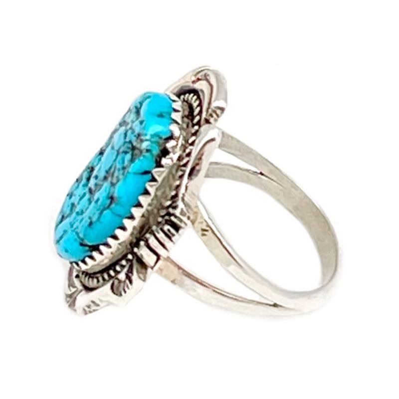 For your consideration is this stunning Navajo sterling silver and Kingman mine turquoise ring in size 8. The ring features intricately hand etched traditional blossom design in sterling silver accented with a Kingman turquoise cabochon. Hallmarked. Superb craftsmanship. The ring is size 8 and measures about 1 1/8" tall on the front. Fab statement piece! FREE SHIPPING ON ALL JEWELRY ORDERS WITHIN THE US!