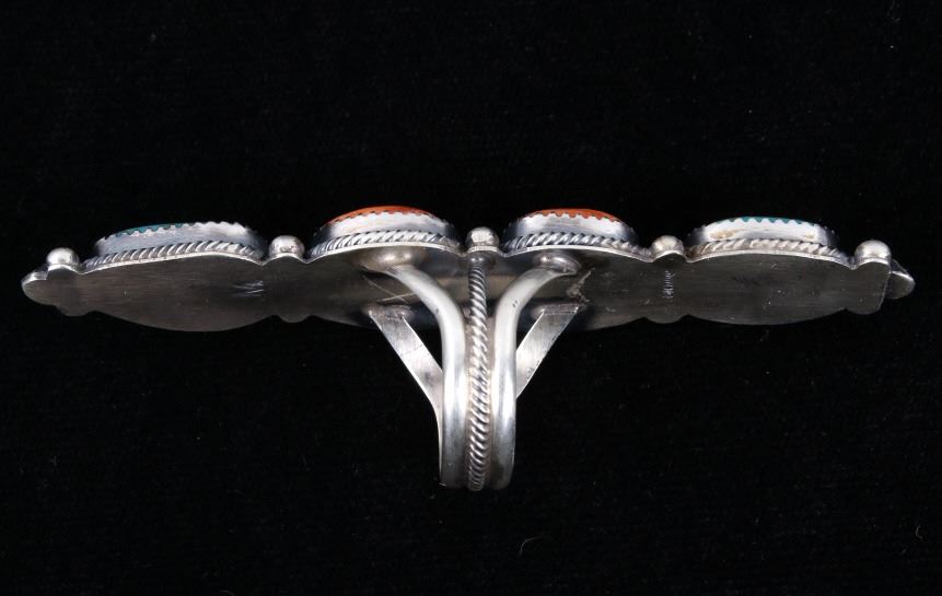 For your consideration is a Juanita Long Navajo Native American sterling silver, Kingman turquoise and orange spiny oyster ring. This large Navajo ring showcases a three-band design with the middle band being a braided rope. The ring showcases four polished gemstones. The topmost and bottom most gemstones are a stunning Kingman turquoise gemstone. The two inner most stones are a gorgeous orange spiny oyster. The back of the ring is stamped with the maker Juanita Long’s hallmark and stamped “Sterling”. The ring measures a US size 8 ½.