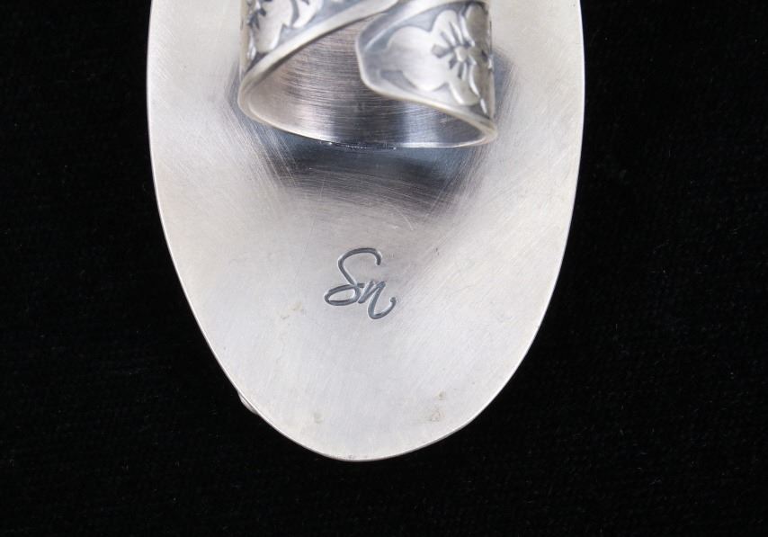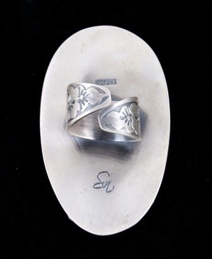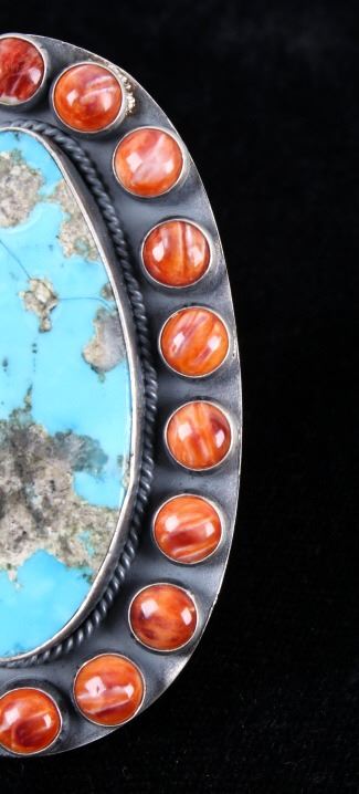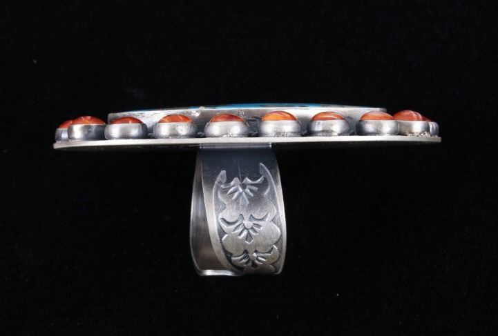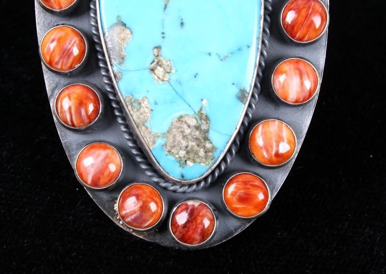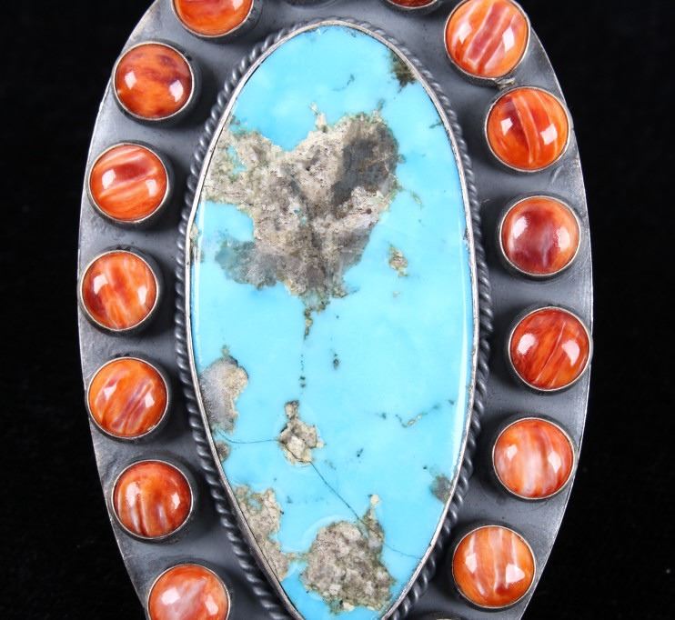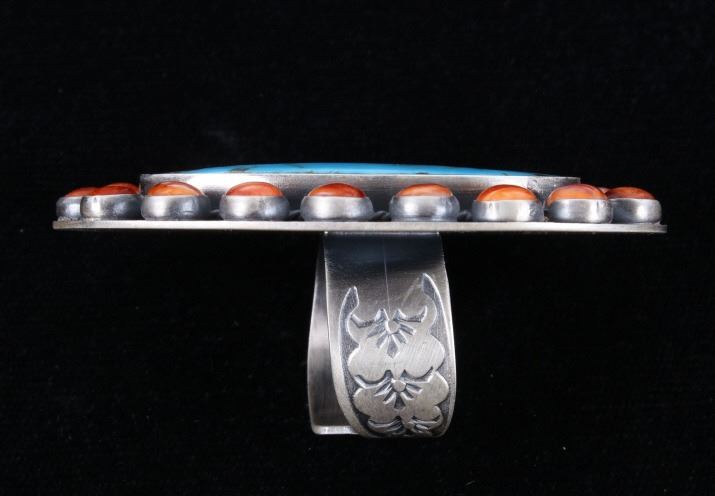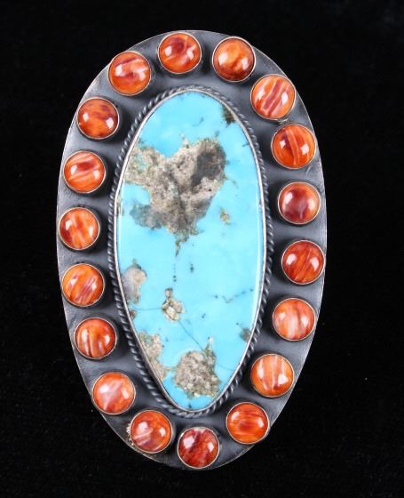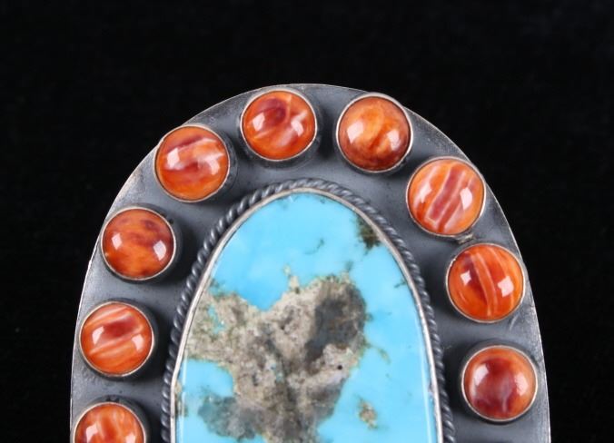 Included in this lot is a Navajo Native American Sandra Nez Kingman turquoise and orange spiny oyster sterling silver ring. This stunning sterling silver ring features a large polished cabochon of Kingman turquoise expertly set in a shadow box display with sterling silver braided twist border. The large Kingman turquoise stone is surrounding by a fantastic display of 18 highly polished orange spiny oyster gemstones. The ring band is beautifully hand stamped. The underside of this ring is stamped with the maker Sandra Nez hallmark and “Sterling”. The ring measures a US size 9.