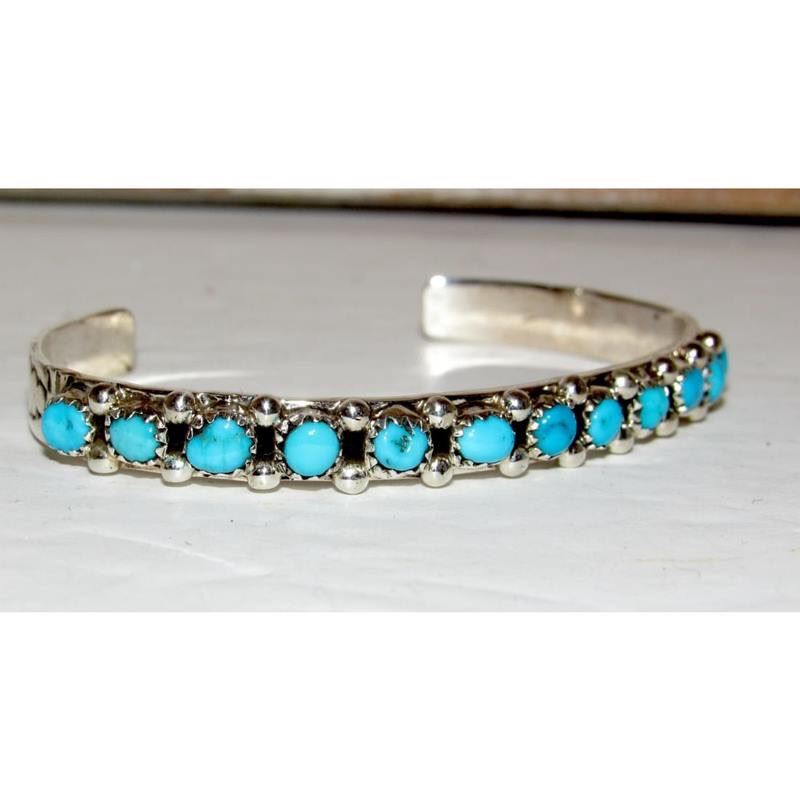 Stunning sterling silver and gorgeous natural Kingman turquoise Native American Navajo stacker cuff bracelet. Traditional hand etched design, accented with a gorgeous, Kingman turquoise cabochons. The inside circumference is about 7" including the gap. The cuff is adjustable. Beautiful example of wearable Native American art to add to any jewelry collection. Several cuffs are available and Kingman turquoise stone matrix may slightly vary from piece to piece. Great to add to your stacker cuff collection! FREE SHIPPING ON ALL JEWELRY ORDERS WITHIN THE US! WE SHIP ALL ITEMS IN-HOUSE!