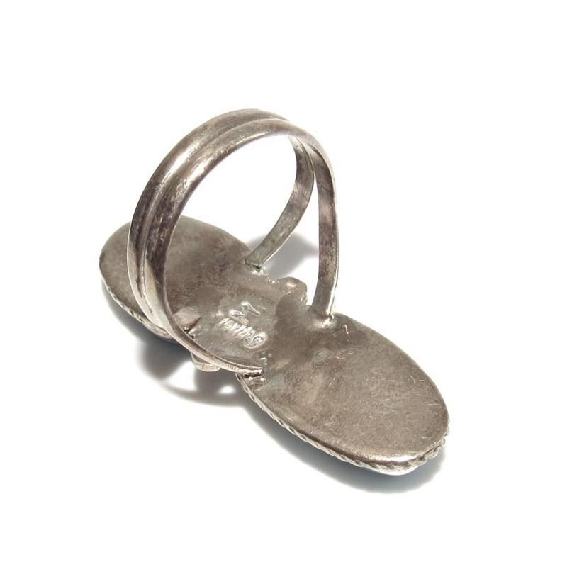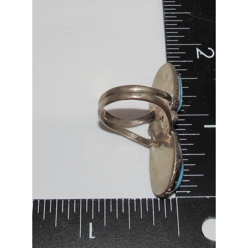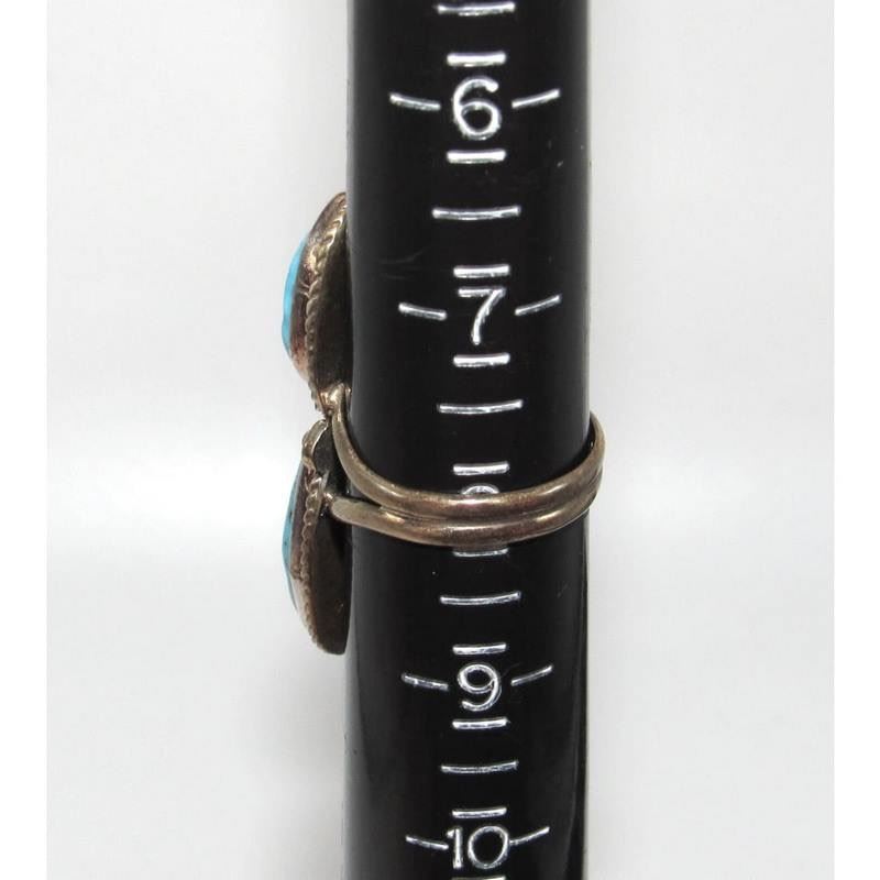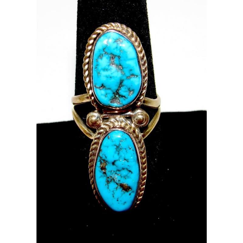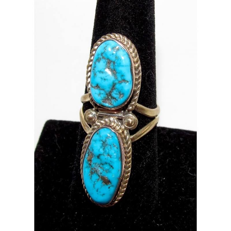 For your consideration is this stunning Native American Navajo sterling silver and two stone Kingman turquoise cabochons statement ring size 8. This fabulous ring features a traditional Native two stone design in sterling silver accented with 2 beautiful natural stones. Hallmarked. Size 8. The front of the ring measures about 1 3/4". Wonderful example of wearable Native American art to add to any collection! FREE SHIPPING ON ALL JEWELRY ORDERS WITHIN THE US!