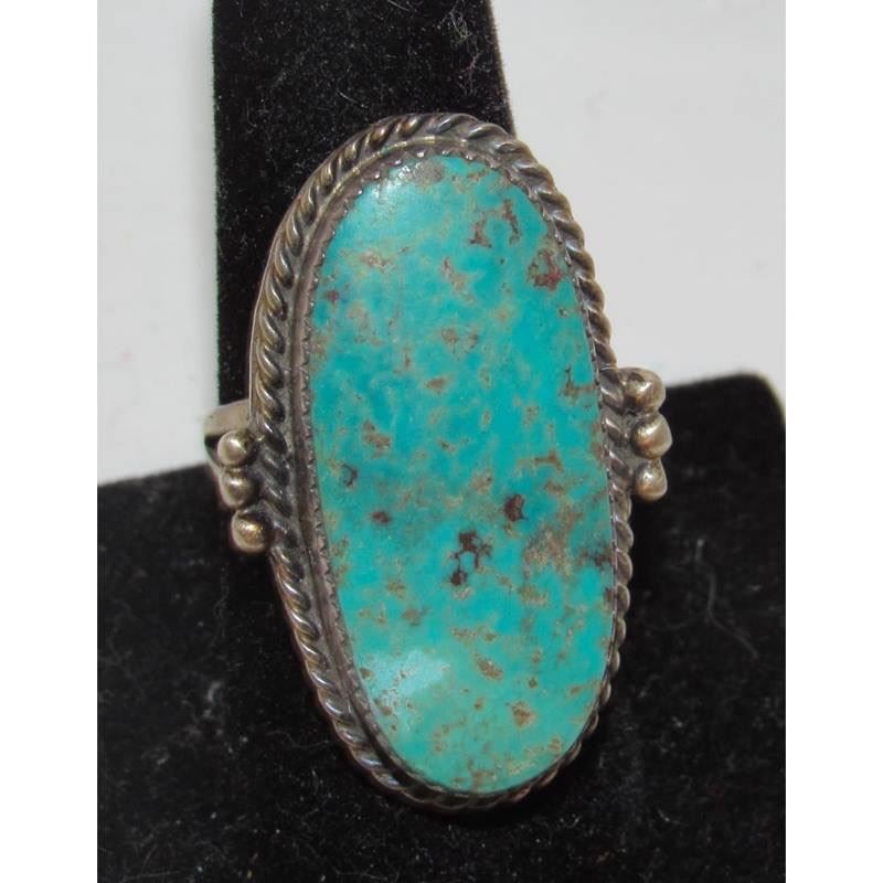 For your consideration is this wonderful traditional Navajo sterling silver and Kingman turquoise statement ring in size 9. The ring features intricately hand etched traditional design in sterling silver accented with an oval Kingman turquoise cabochon. Wonderful craftsmanship, exceptional attention to detail in this collectible piece. The ring is size 9 and measures about 1 1/2" tall on the front. Fab statement piece! FREE SHIPPING ON ALL JEWELRY ORDERS WITHIN THE US! WE SHIP ALL ITEMS IN-HOUSE!