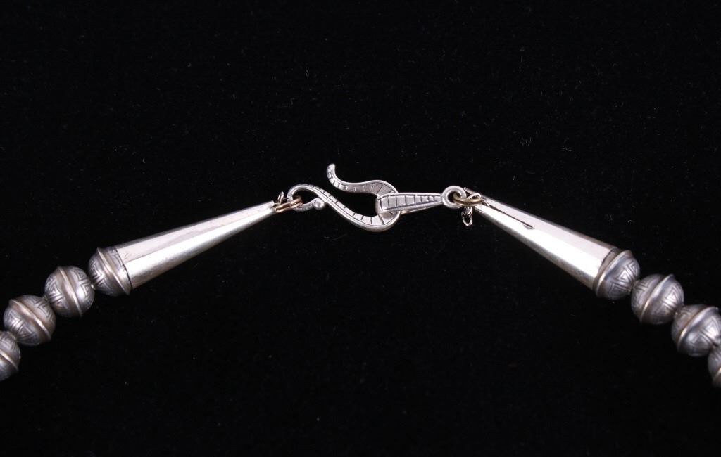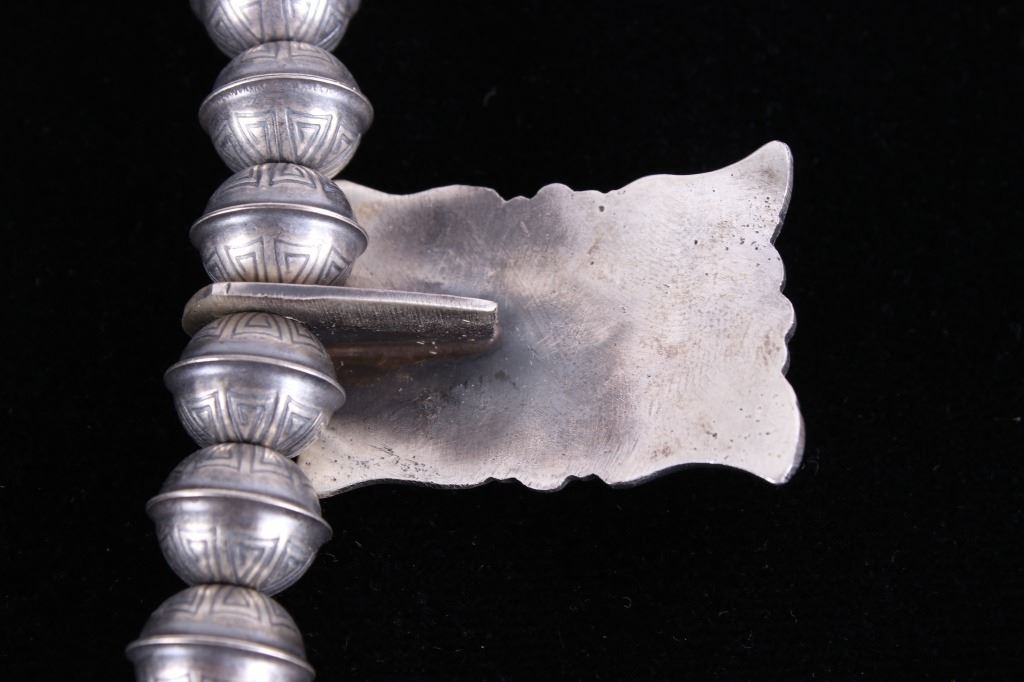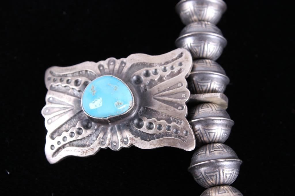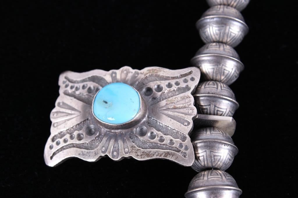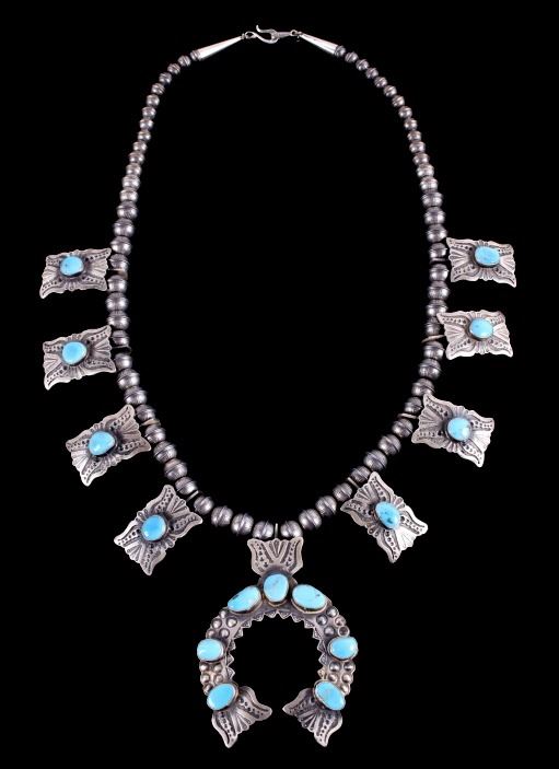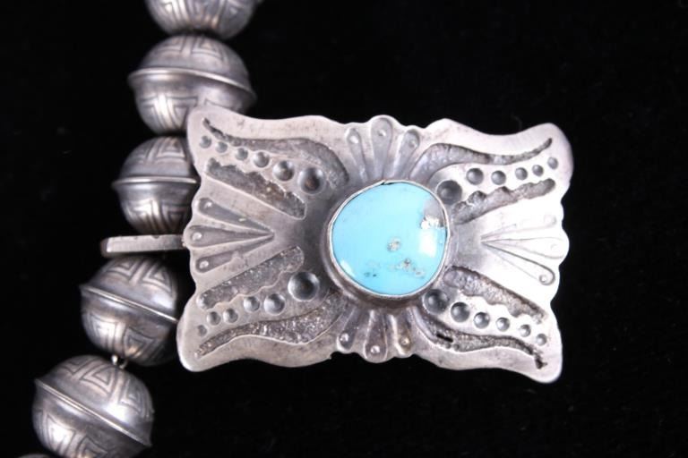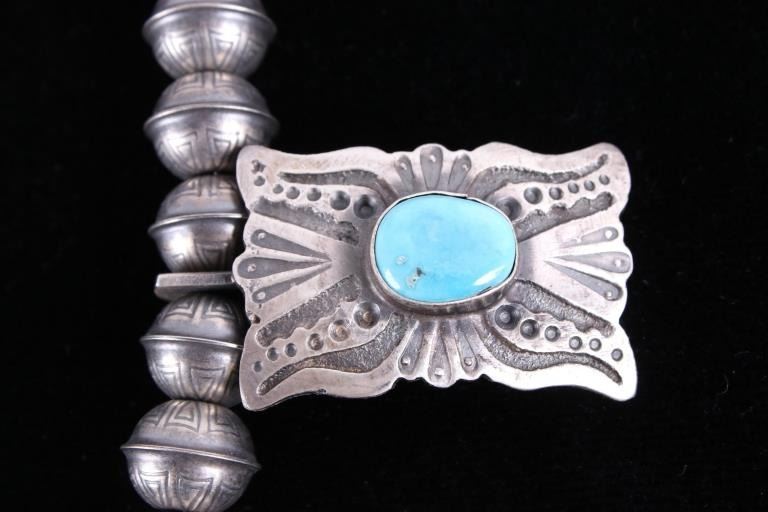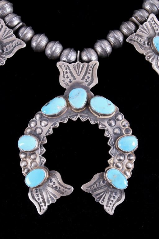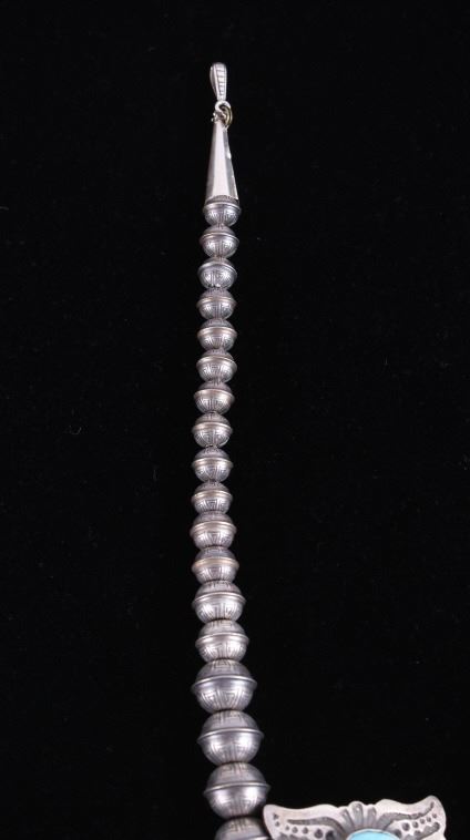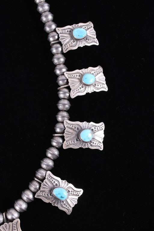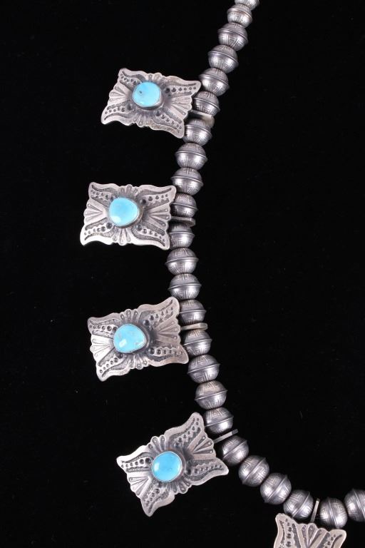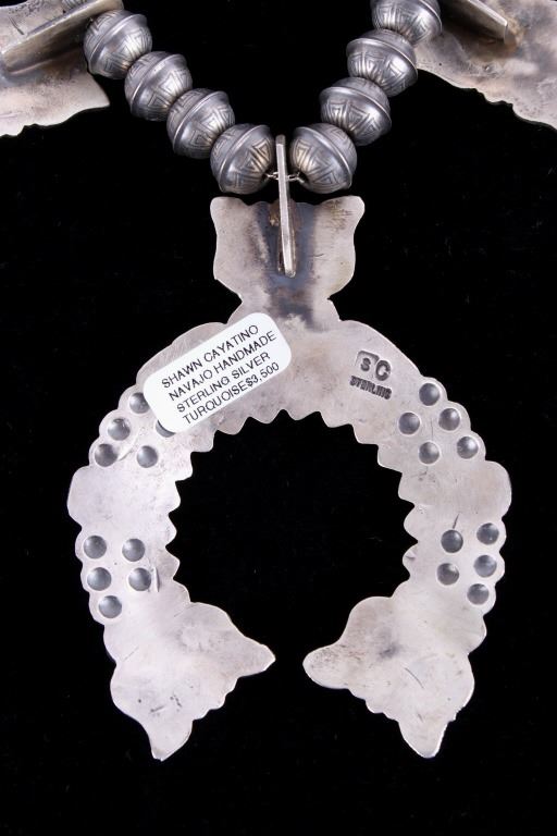 Included in this lot is a heavy Navajo Native American sterling silver and Kingman turquoise squash blossom necklace. This heavy necklace is constructed from a dark gray patina’d sterling silver. The Naja pendant is strung on a beaded concho strand. These conchos all show a heavily stamped design and held together by a sterling silver aglet tips and hook clasp. The blossoms are heavily stamped and shows a traditional south west design. Each blossom also showcases a beautiful Kingman turquoise gemstone in a shadow box setting. The back the Naja is stamped SC and sterling for Navajo artist Shawn Cayatino. Each blossom measures 1 ½” x 1”. The Naja features seven gorgeous Kingman turquoise gemstones all set in a shadowbox setting complimenting the blossoms. The Naja also shows a heavily hand stamped design and measures 3 ¾” x 3”. The squash blossom necklace measures 29 ¼” when unclasped.