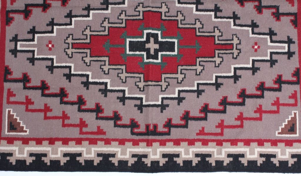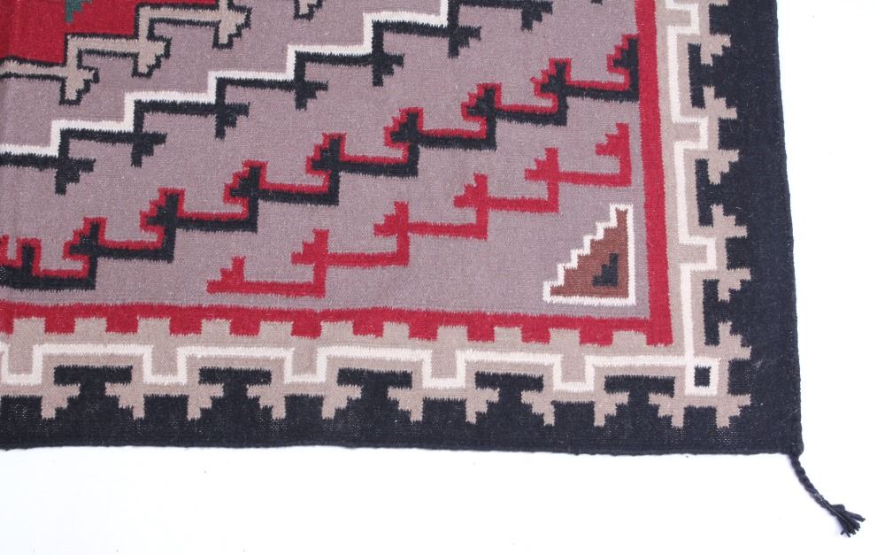The lot features a vertical loom hand knotted wool rug in a very rare large Navajo Native American Indian Klagetoh Pattern style. The wonderful large size collectible floor covering shows the Klagetoh Pattern style design. Klagetoh is located just south of Ganado and 10 miles North of Wide Ruins trading posts. The English translation is “hidden springs”. The Klagetoh weaving is very similar to the Ganado rugs, but with a predominantly gray background instead of the Ganado’s red. The rug was hand woven by skilled weavers and shows bright natural style dyes in a traditional geometric Klagetoh Pattern. The rug is made in the style, manner and quality craftsmanship of Navajo Weavings, but not made by a Navajo Indian. The rug is hand knotted and shows fine condition. The piece shows a large size of 4 foot by 6 foot with an additional 5” long end tassel on each corner, typical of correct Navajo rugs. The amazing detail can clearly be seen and a Navajo Original of this fine of rug would be valued at over $10,000 and would be displayed on a wall as art, where-as this piece could truly be used in your home.