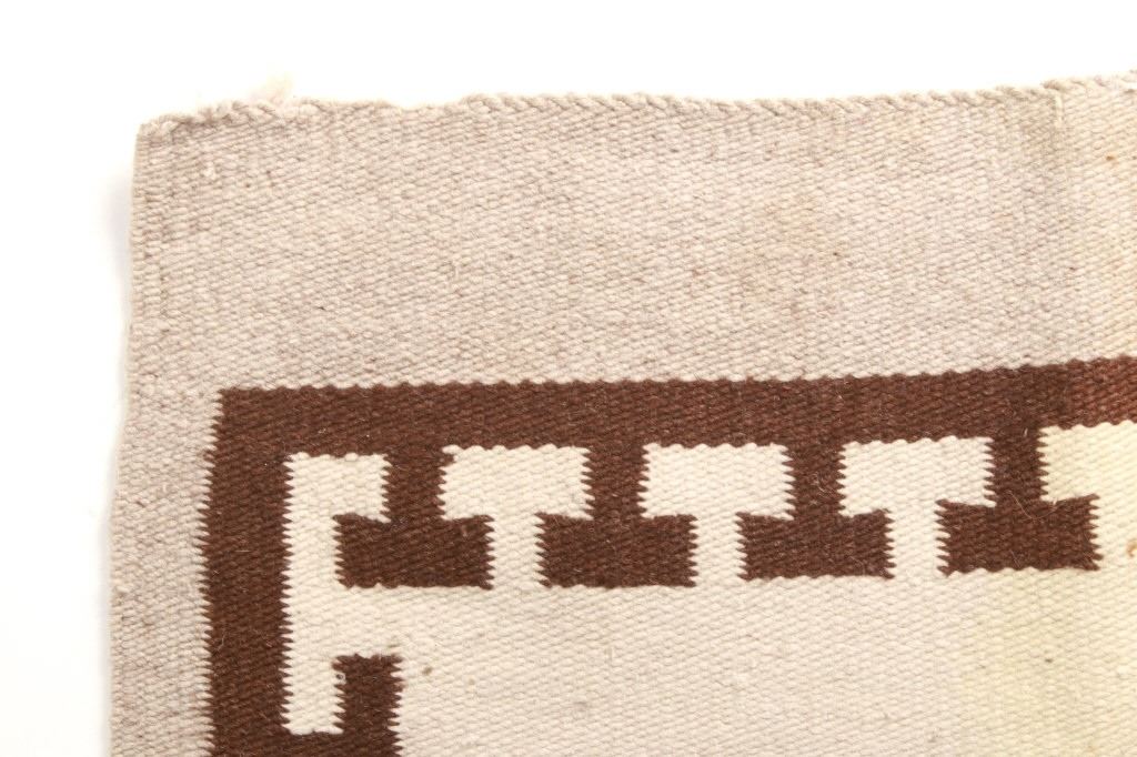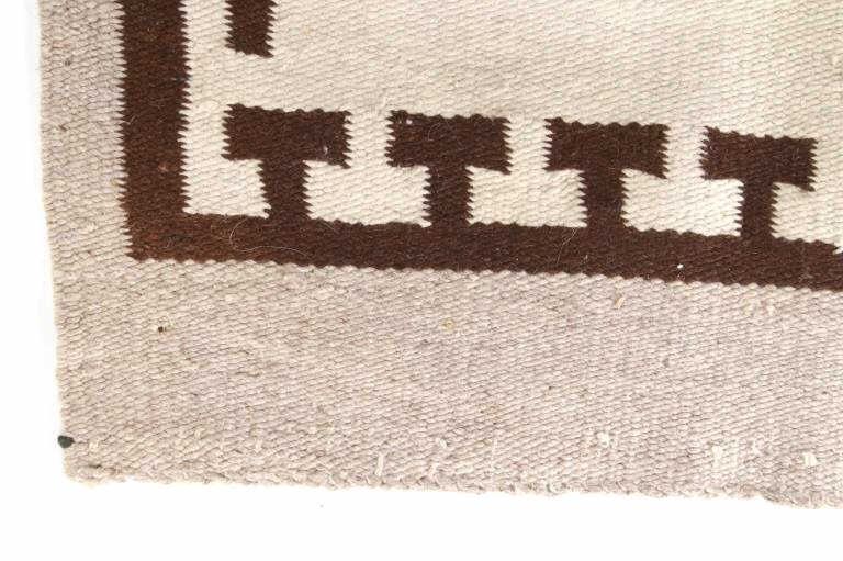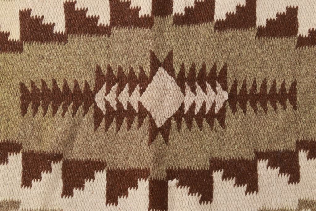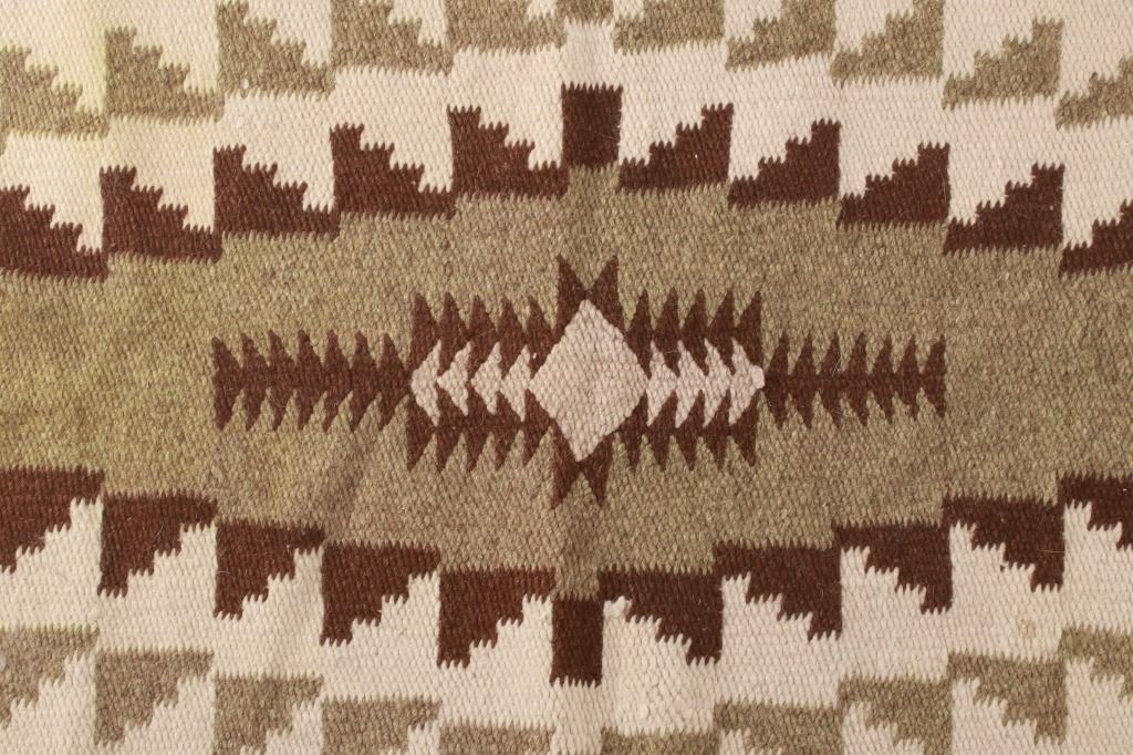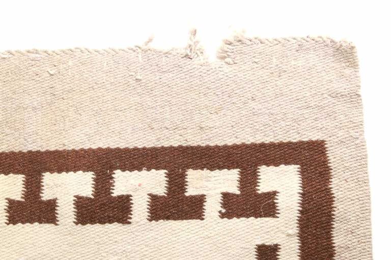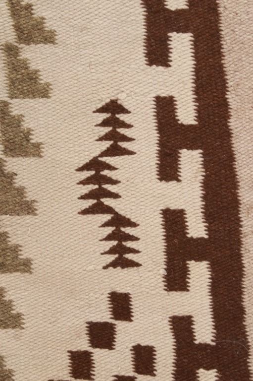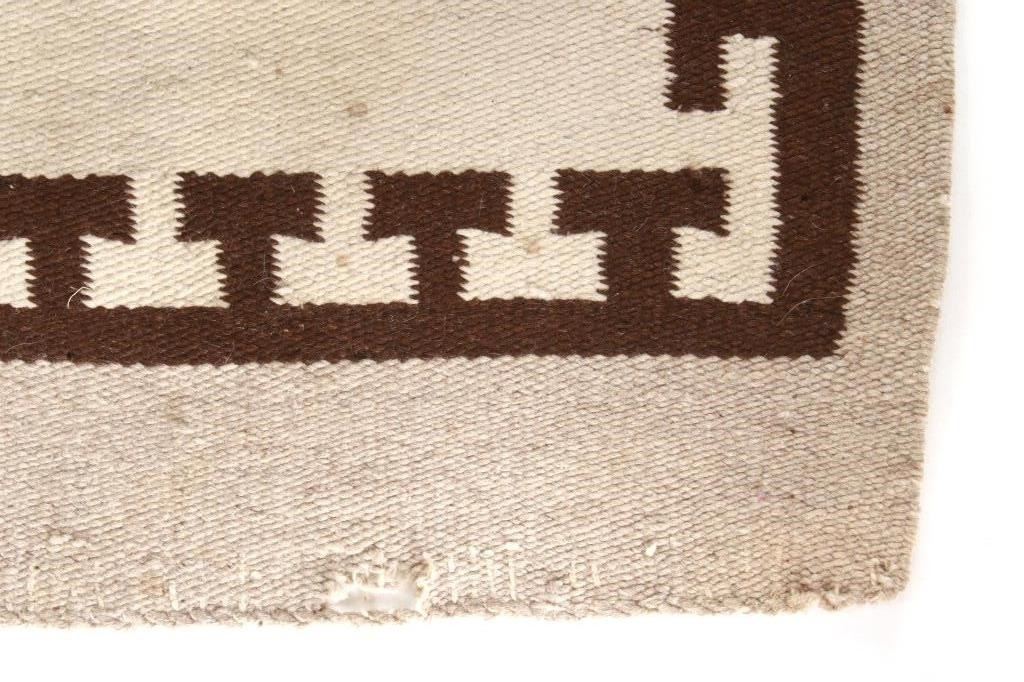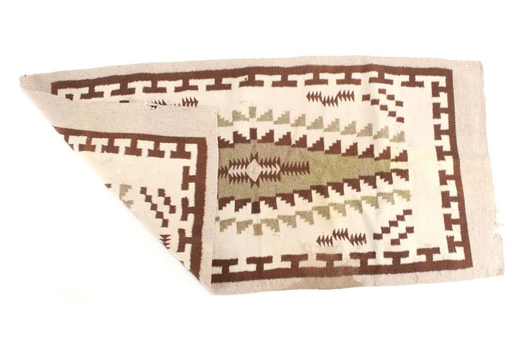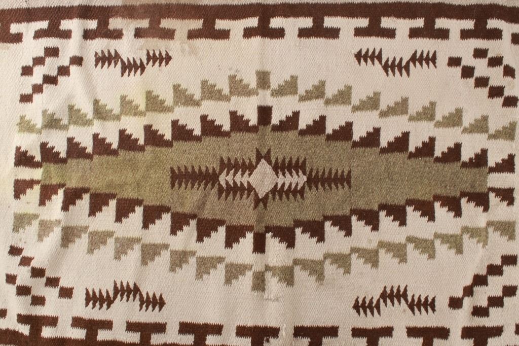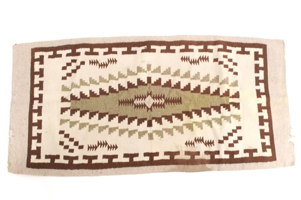 Featured in this lot is this Navajo Klagetoh Trading Post rug circa 1930's. The rug features a off white to grey field with stepped and eye dazzler patterns throughout with colors of brown and olive green with a large medallion in the center of the rug with this iconic Kagetoh design. The English translation is “hidden springs.” The Klagetoh weaving is very similar to the Ganado rugs, but with a predominantly gray background instead of the Ganado’s red. Some experts do not consider Klagetoh a specific regional rug, rather it is considered a sub-type of Ganado. The condition of this rug is fair to good with slight wear to the ends of this rug but otherwise in fair to good overall condition. The measurements of this rug are 57" x 29".