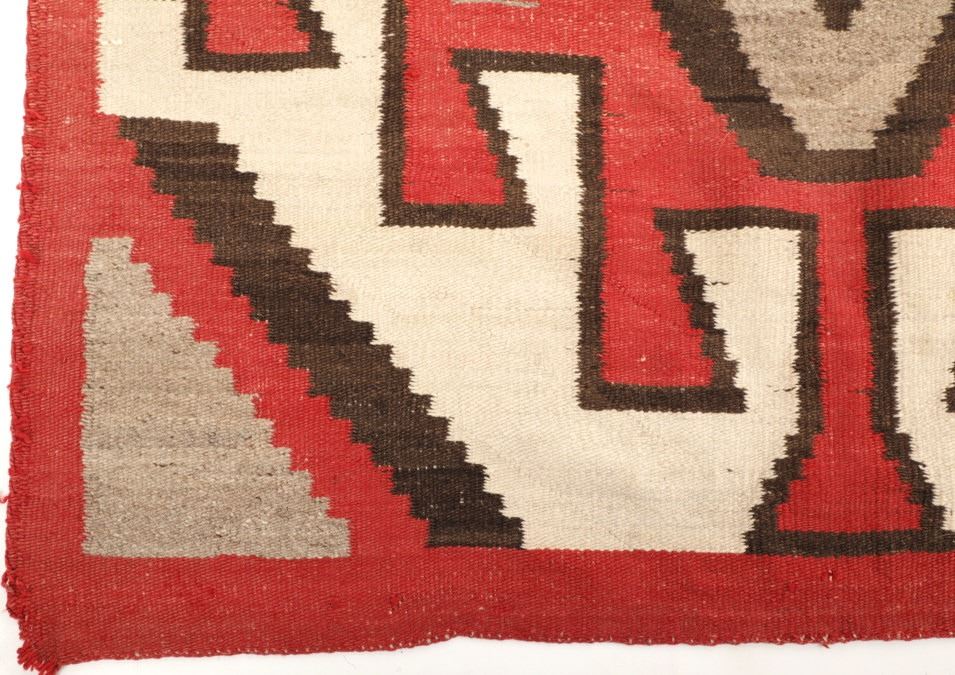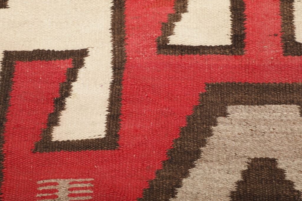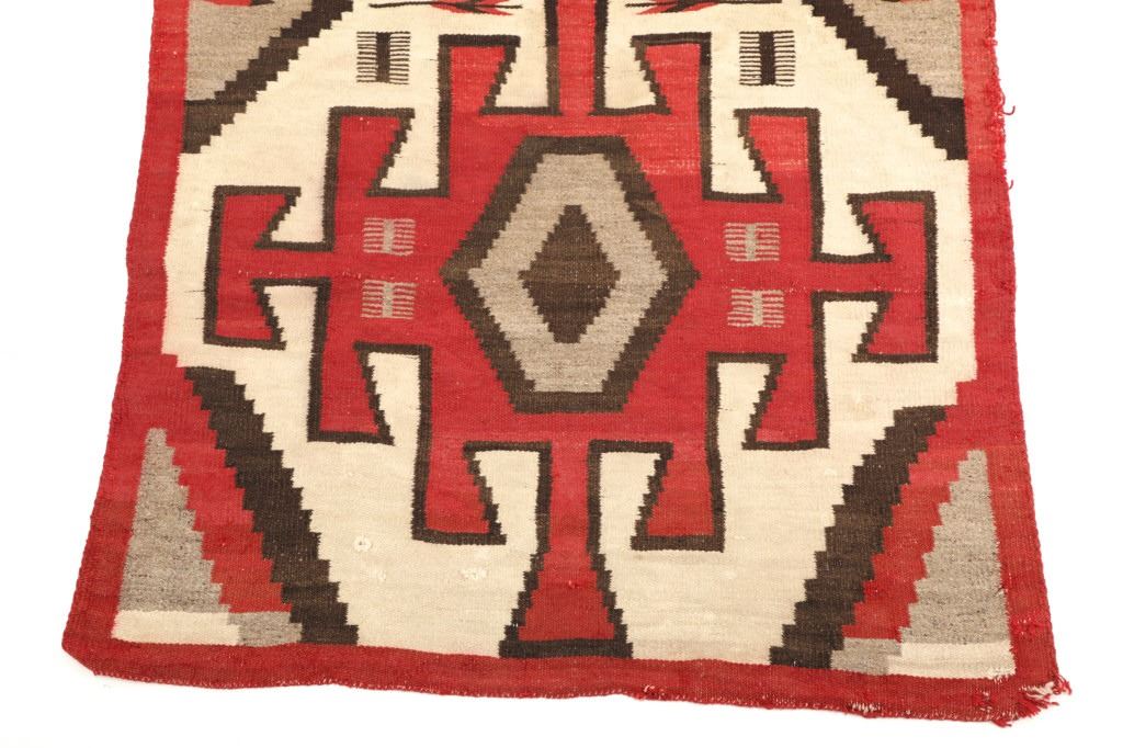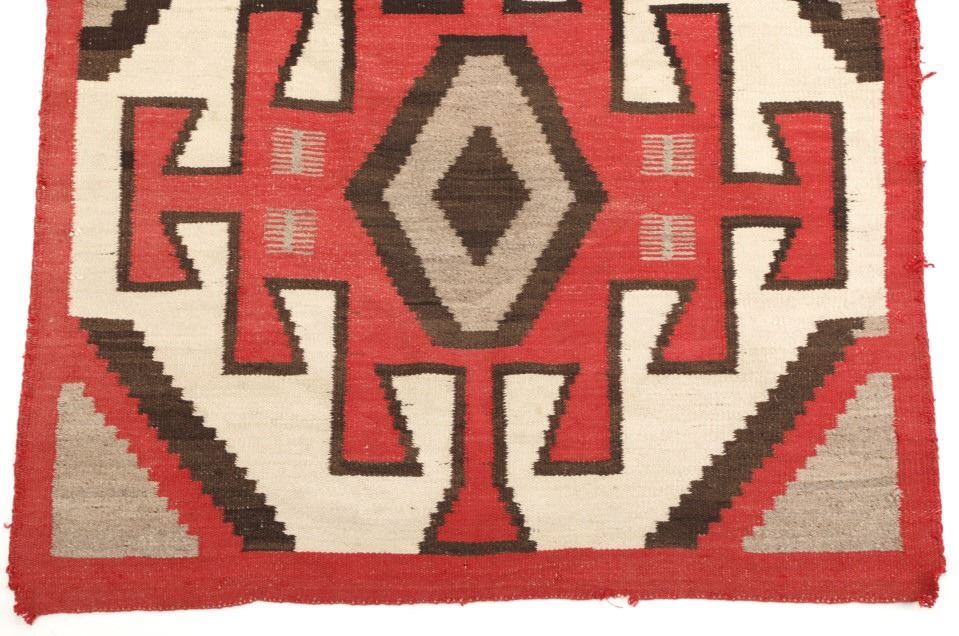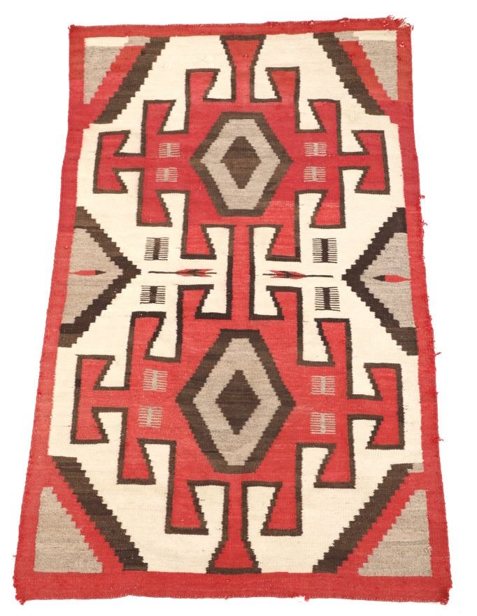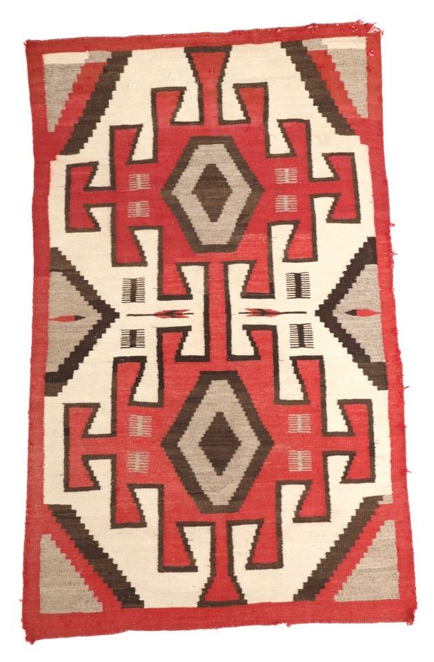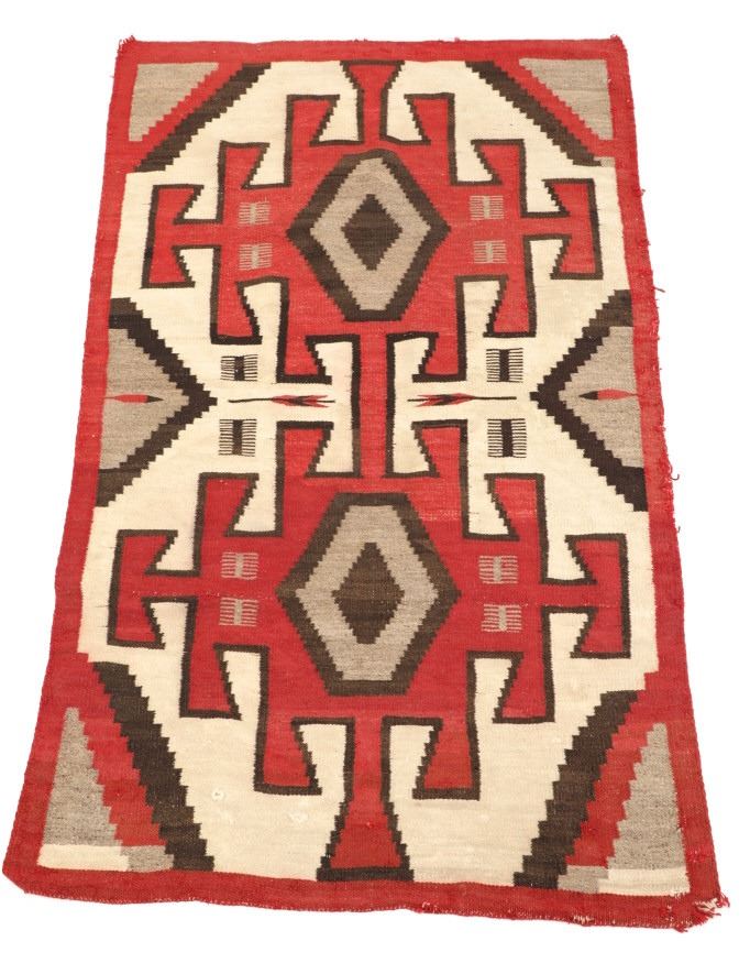 Featured in this lot is this Navajo Klagetoh Trading Post rug circa 1930's. The rug features a wonderfully and professionally crafted hand spun wool construction with a beautiful central motif and red aniline dyes set to a grey field and black lining accents to the central medallion and the stepped decorations in the shoulders. The rug features a Lazy Lines throughout the rug consistent with showing age and authenticity of the rug. Klagetoh is located just south of Ganado and 10 miles north of Wide Ruins. The English translation is “hidden springs”. The Klagetoh weaving is very similar to the Ganado rugs, but with a predominantly gray background instead of the Ganado’s red. Some experts do not consider Klagetoh a specific regional rug but a sub-type of Ganado. The rug shows accent lines that are impossible to recreate showing this rug to be an original weaving with no apparent repairs to the rug. The condition of this rug is this good with some wear to the coloration of the rug but otherwise shows good overall condition. The measurements of this rug are 71" x 44". The thread count is 254 threads per square inch.