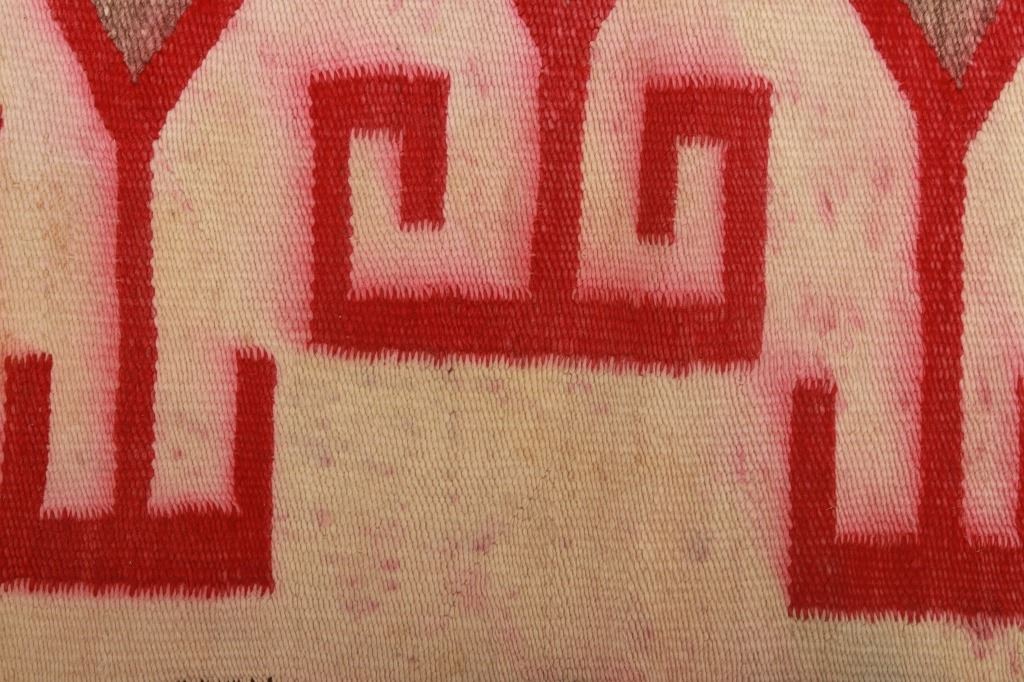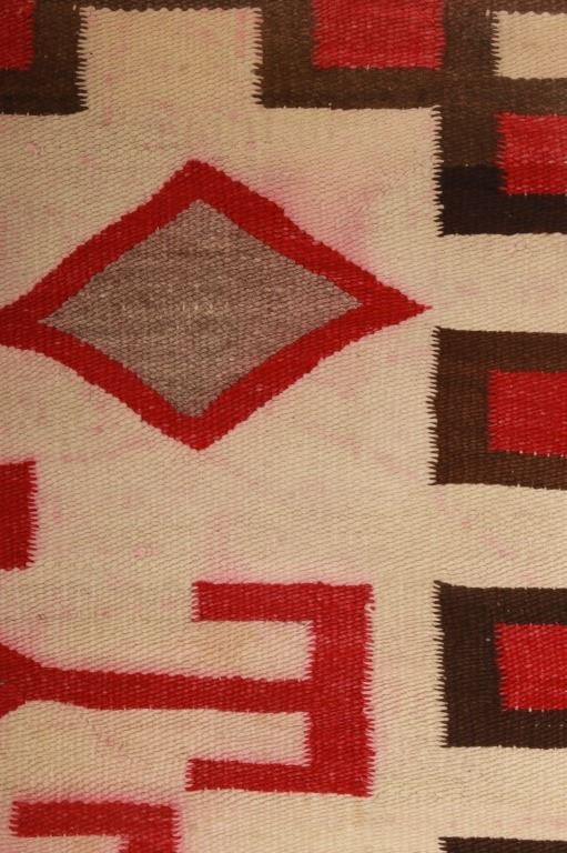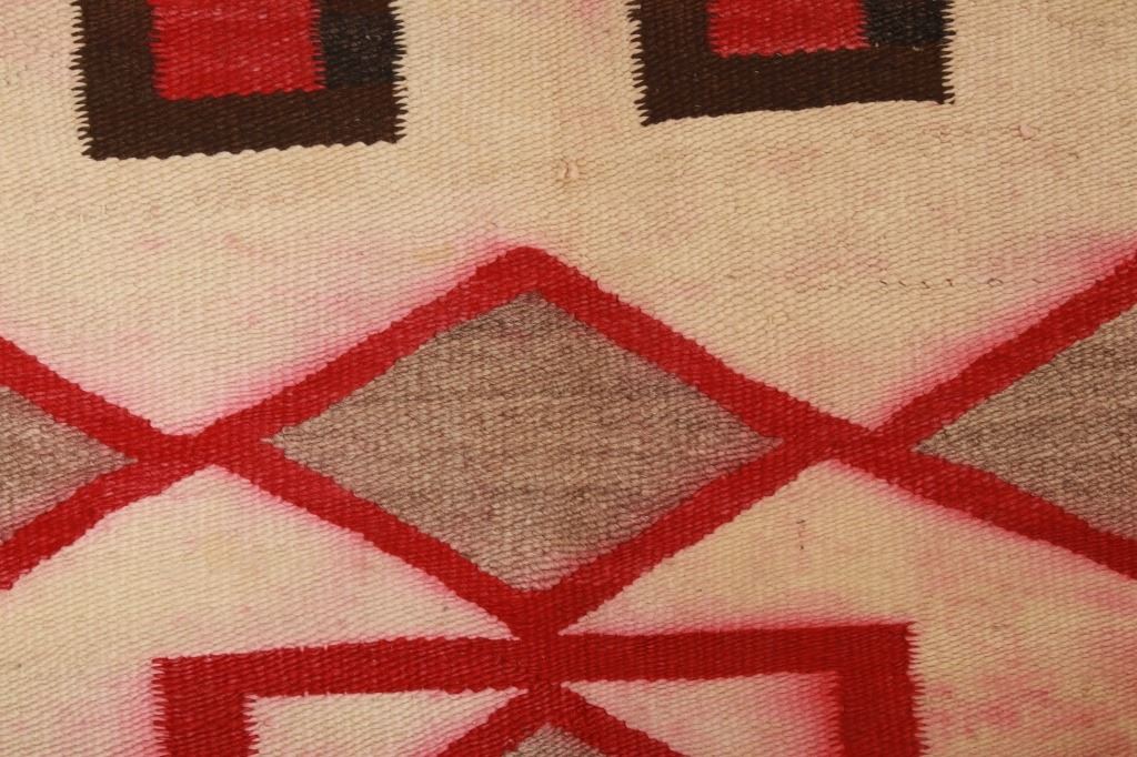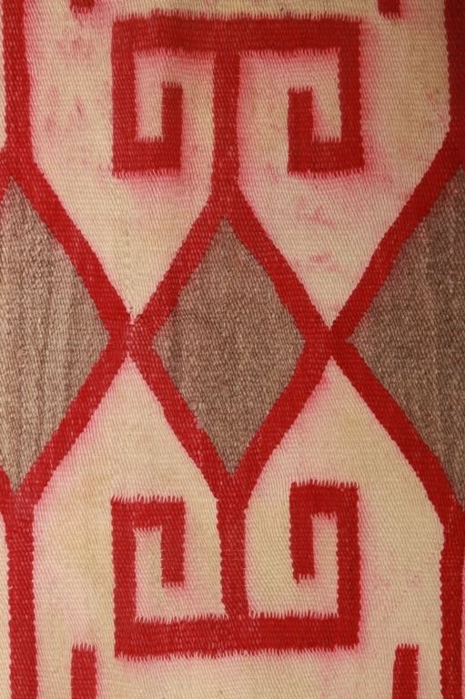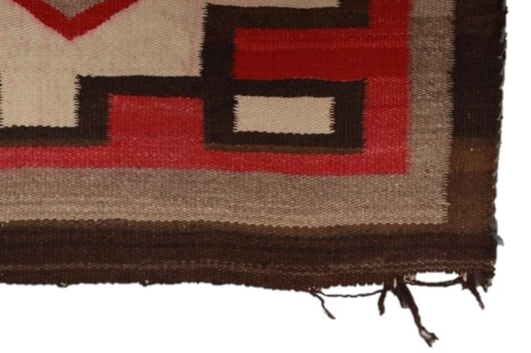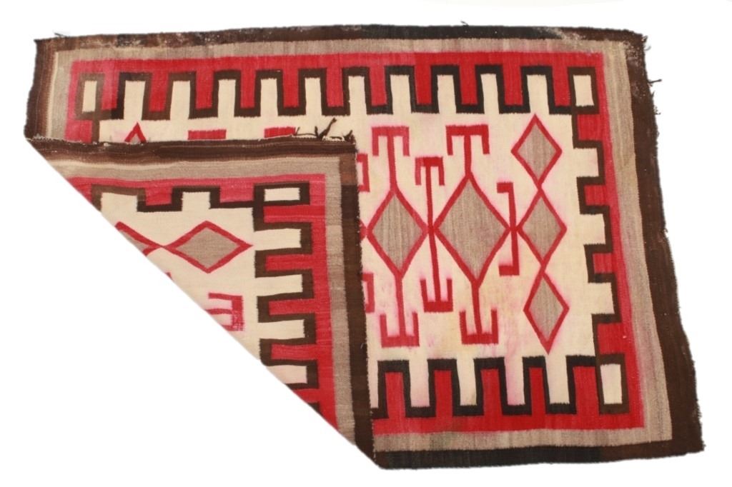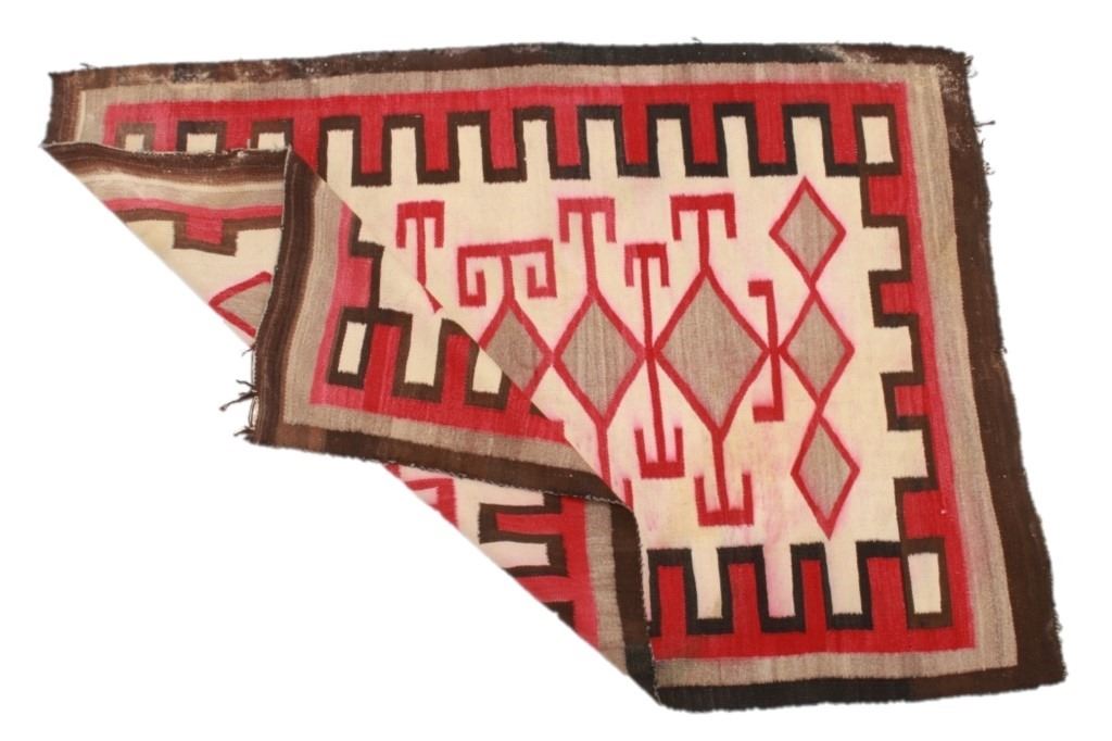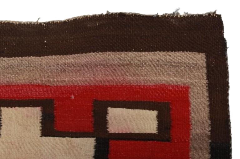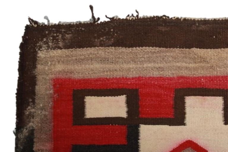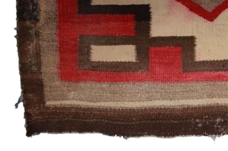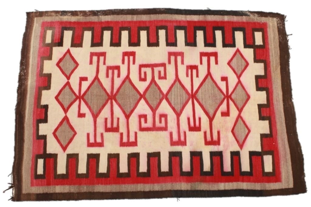 Featured in this lot is this Navajo Klagetoh trading post rug, circa 1900's. The rug features a large stepped geometric medallion in the rug's central region and a border of double bands and a geometric set of stepped rectangles. The coloration of this rug includes a field of off-white, with the medallion colored red and a border of brown with grey, red, and dark brown layers. Klagetoh is located just south of Ganado and 10 miles north of Wide Ruins. The English translation is “hidden springs”. The Klagetoh weaving is very similar to the Ganado rugs, but with a predominantly gray background instead of the Ganado’s red. Some experts do not consider Klagetoh a specific regional rug, rather it is considered a sub-type of Ganado. The condition of this rug is fair and really shows its age, with wear and bleeding consistent with the age of the rug. The measurements of this 67 1/2" x 47".