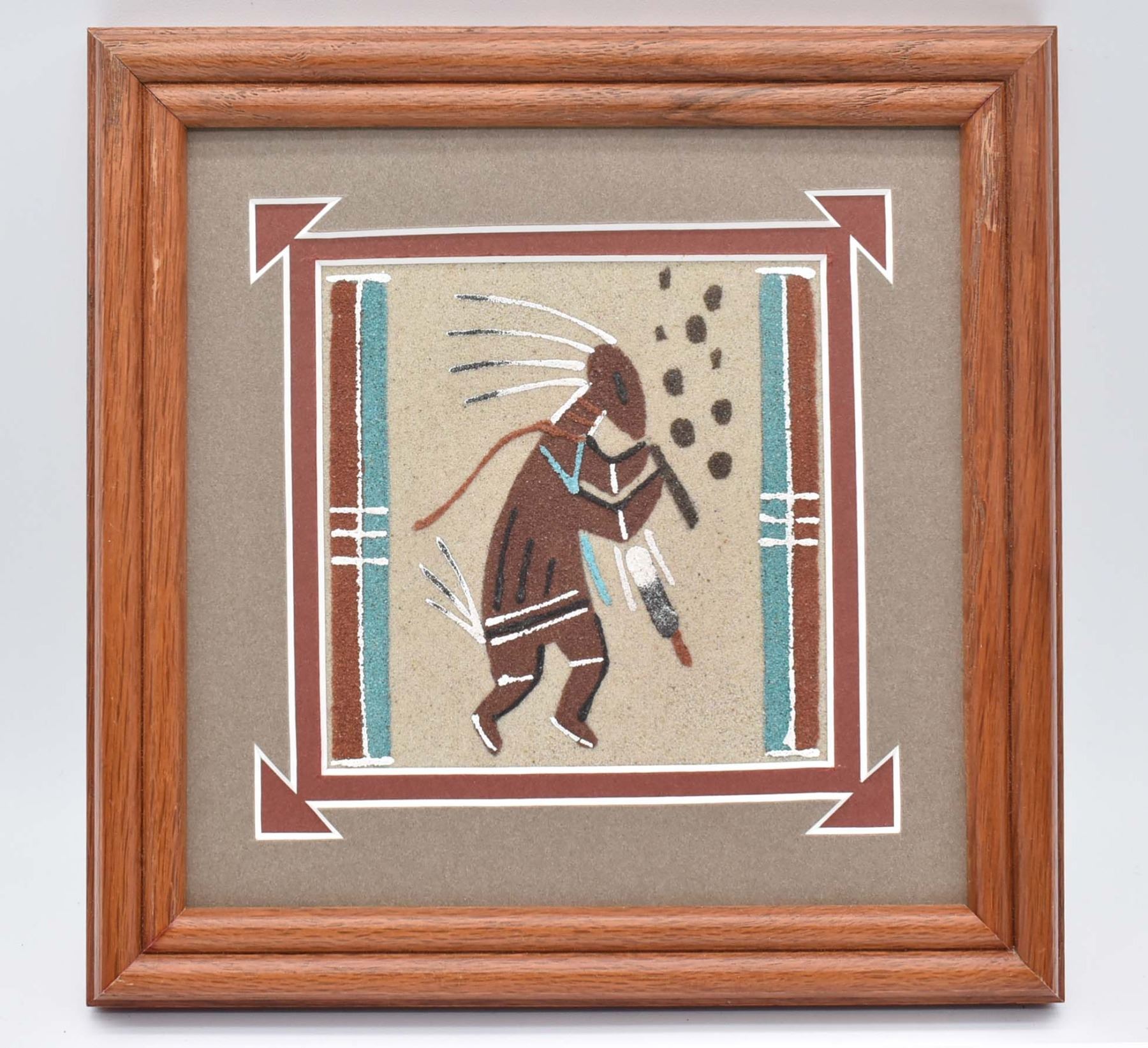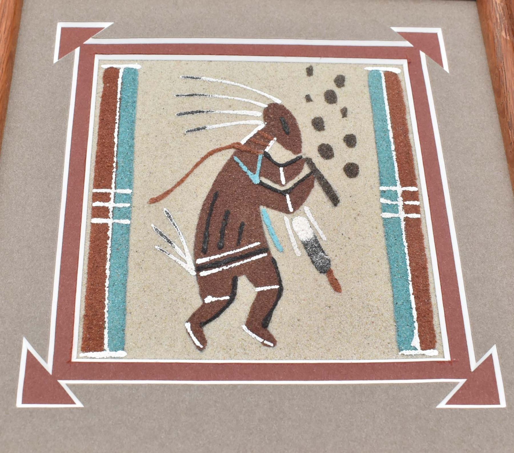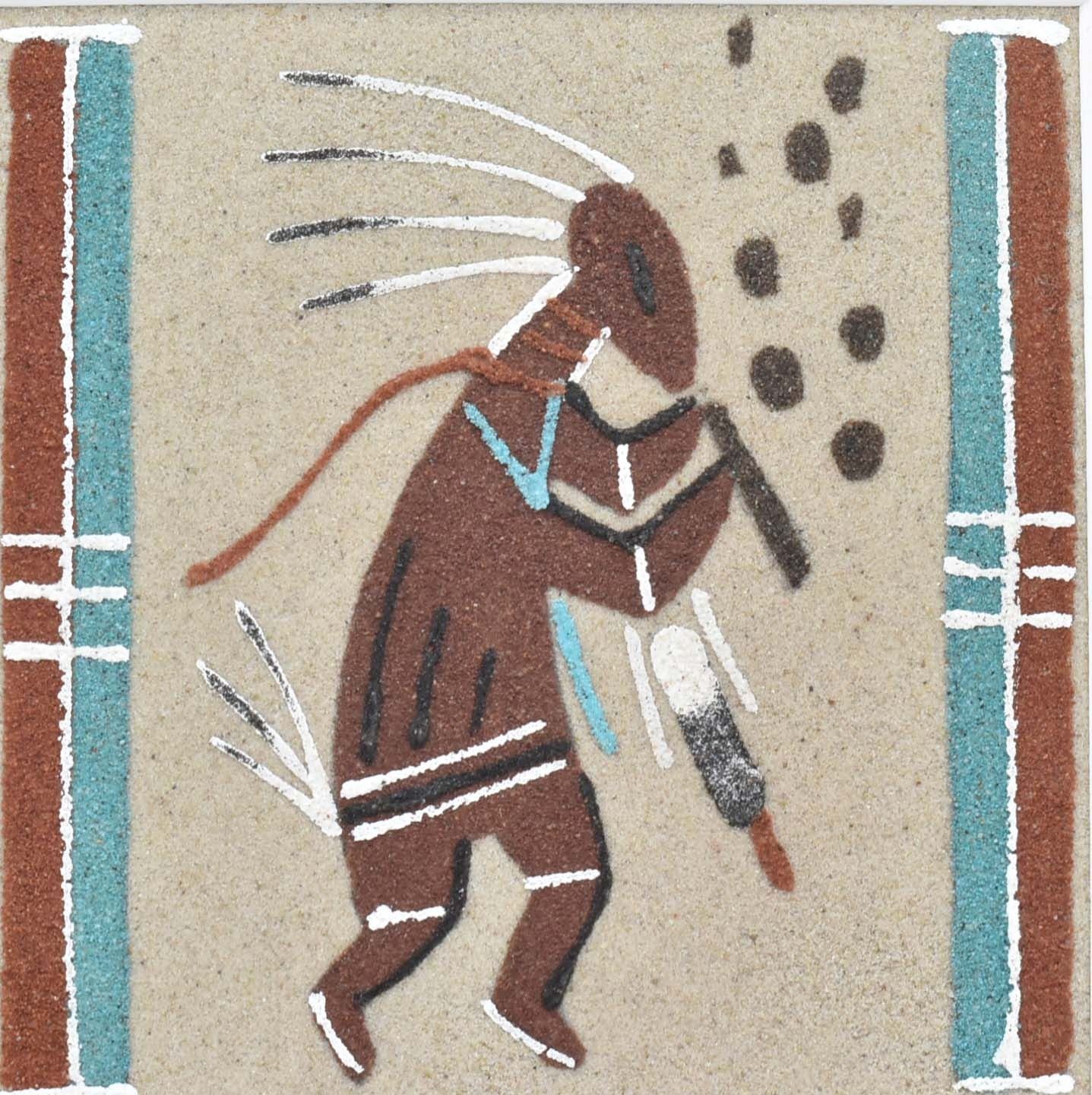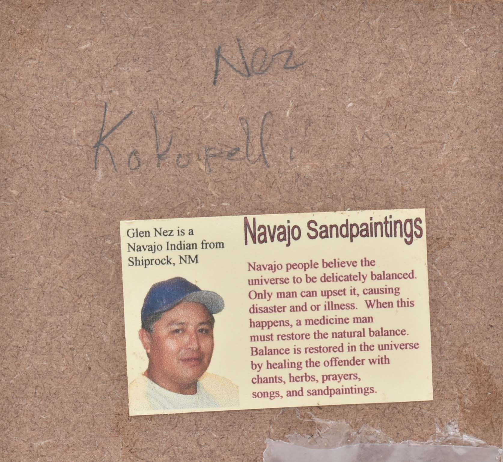 Framed Native American Navajo Kokopelli Sand Painting by Glen Nez of Shiprock NM, overall measurement of 3'' x 4.5'' and has informational about artist on back