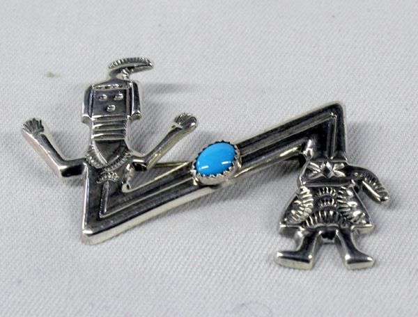 Navajo Kokopelli Sterling & Turquoise Pin by Begay. Intriguing design in this kokopelli pin with a small oval turquoise cabochon in the center. It is stamped ''F L Begay'' ''Sterling'', measuring 1.5'' high x 2.25'' wide.
