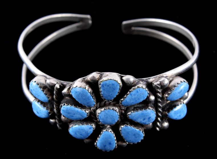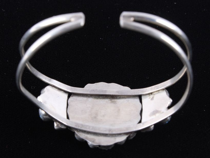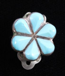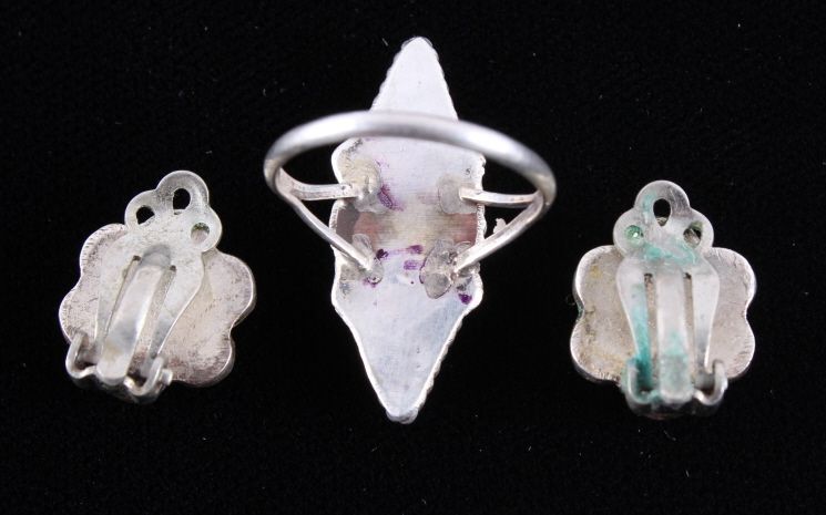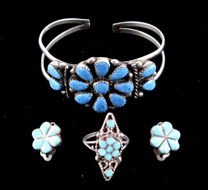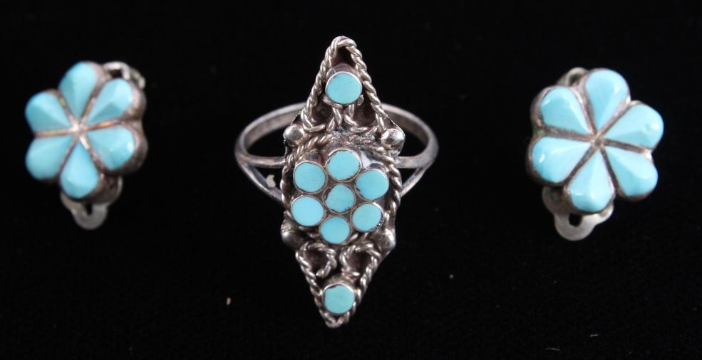 turquoise earrings and ring. These are all from the Navajo Native American Indians. Vintage. Bracelet is 2.25""x1 1/8""x2"". Earrings are 5/8""x1/2"". Ring" is 1 1/8"x7/8"