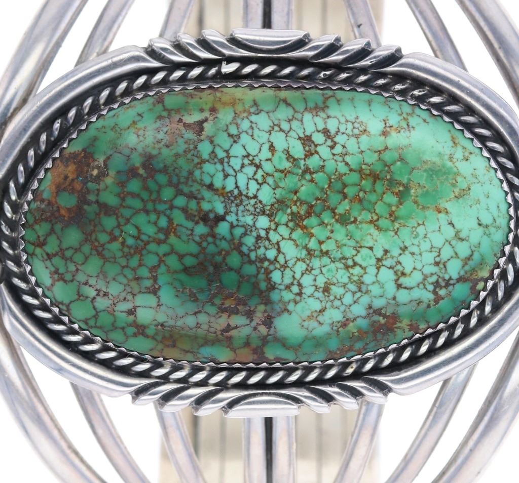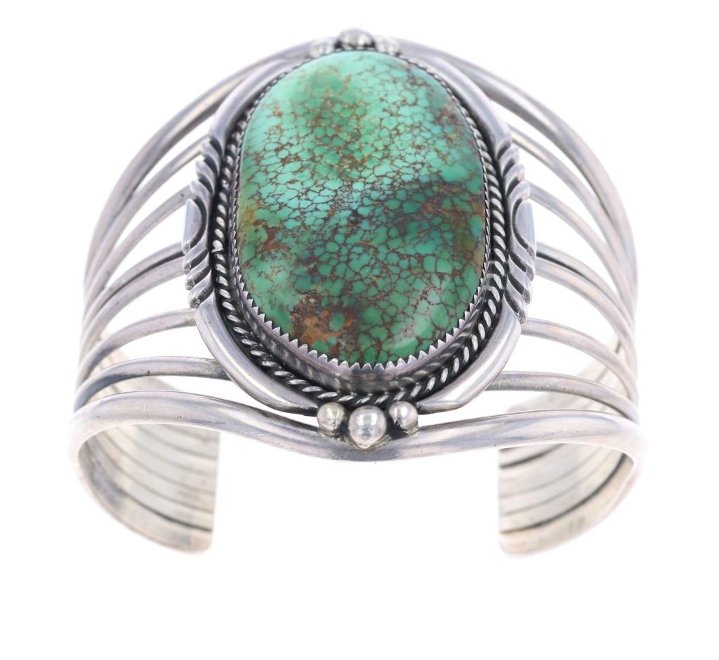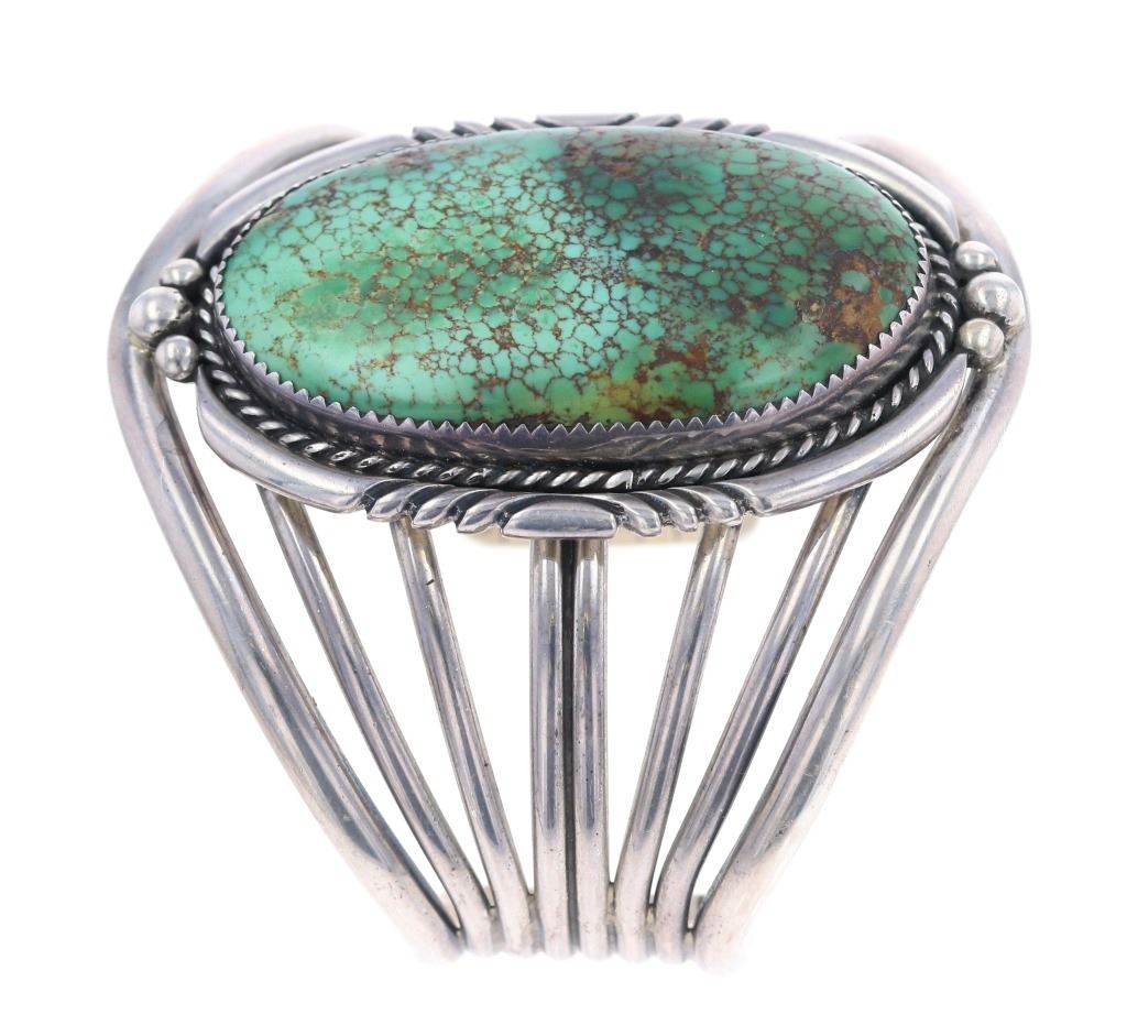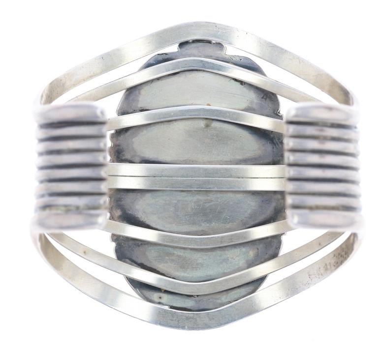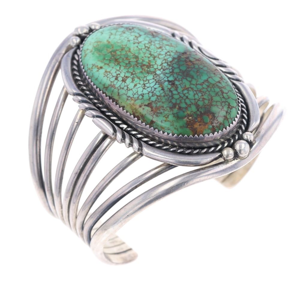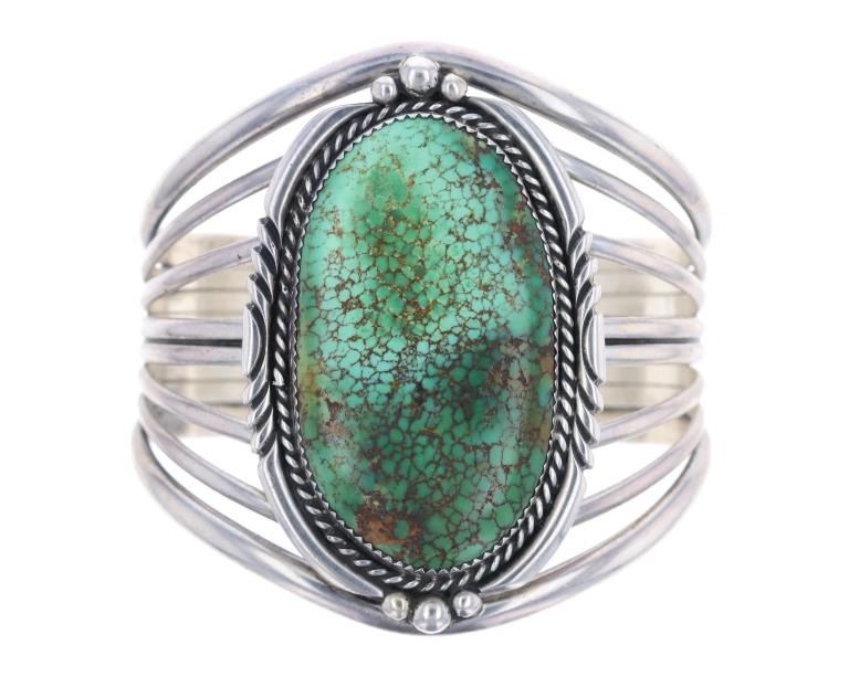 Featured in this lot is this Navajo sterling silver and Royston turquoise bracelet. The bracelet features a wonderfully and professionally crafted seven bar sterling silver construction and a large Royston turquoise oval cut cabochon with a lovely dual color scheme and extensive brown matrix spiderwebbing. The condition of this bracelet is good, with no obvious signs of damage. The measurements of this bracelet are 2" x 2 1/2" x 2 1/2" and the circumference of the bracelet is 4 1/4". The collective weight of this bracelet is 70.3 g.