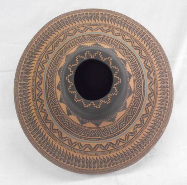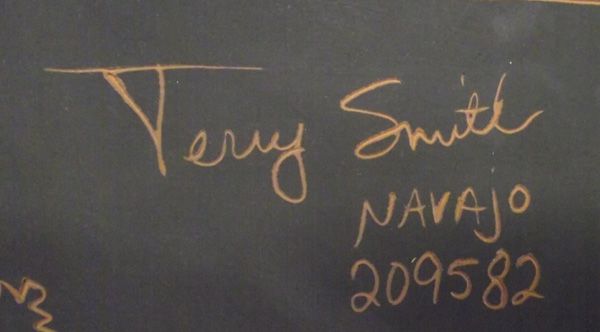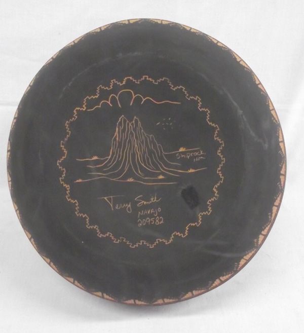 Native American Navajo Large Sgrafitto Pottery Jar - Terry Smith. Intricate feather and other symbolic designs surround this beautiful Navajo pottery jar. The designs are dark brown and the base color of the jar is reddish brown. There is a turquoise colored ring around the lower neck. On the bottom, the artist has etched a scene of the Ship Rock Mesa in New Mexico and his signature, ''Terry Smith Navajo 209582.'' It measures 12''Hx14''W.