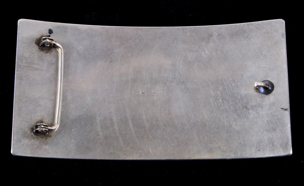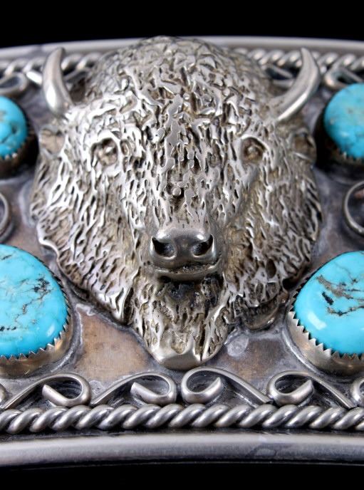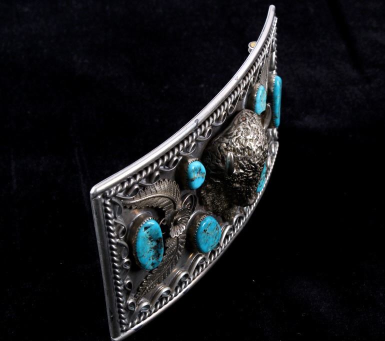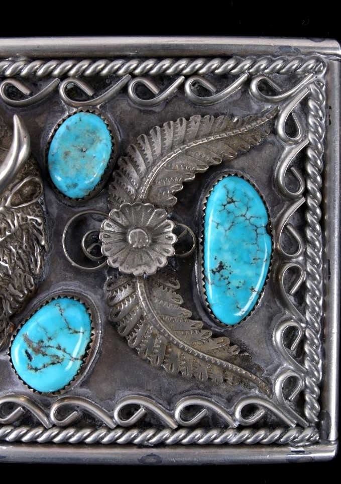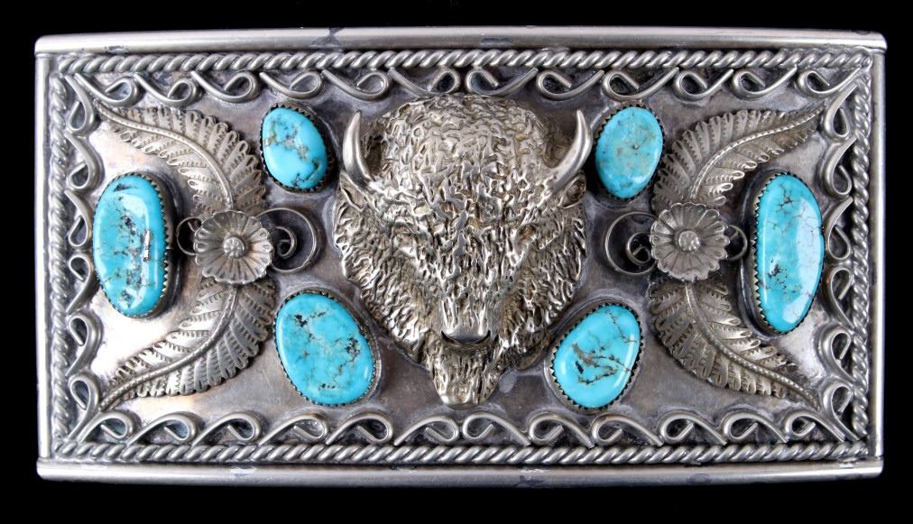 Included in this lot is a signed Navajo Native American sterling silver buffalo and Morenci turquoise belt buckle. This large solid sterling piece features six Morenci turquoise cabochons. The focal point of this belt buckle is the wonderfully detailed raised buffalo. The buffalo is accented by a floral pattern and braided silver rope design. The back of the buckle is stamped "AL LEE". The buckle measures 5 3/4" x 3".