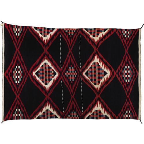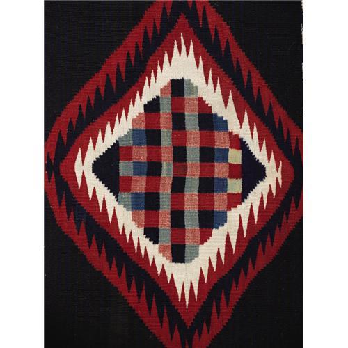 <B>Classic Navajo Moki Style Man's Serape from the Fred Harvey Collection</B></I><BR>Circa 1870<BR>Length 73 1/2 in. Width 53 in.<BR><BR>This striking wearing blanket features a unique pattern composed of full and halved serrated diamonds, each enclosing a colorful checkerboard design, and overlaying the fine Moki striped ground. The design is accented by two narrow strips of elongated parallelograms across the center and narrow white end bands. "While almost all classic and late classic Moki serapes are divided into horizontal zones, this Moki conforms to the classic format at work in Navajo bayeta serapes and poncho serapes: there is an overall design built around a central diamond, and each design element connects and extends the elements adjacent to it. The presence of checkered design motifs within the serrated diamonds is unique to this example, and echoes the plaid designs at work in historic Hopi bachelor blankets and prehistoric Anasazi ceramic ware."1<BR>The yarns in this weaving are as follows: The dark reds are raveled bayeta, dyed with a combination of both lac and cochineal, measuring 5% lac and 95% cochineal (Dye analysis was provided by David Wenger, Ph.D.); the pinks are the same raveled bayeta recarded and respun with white to make pink; the blues are handspun dyed with indigo; the whites and browns are undyed handspun; and the green is handspun dyed with combinations of indigo and vegetal dyes.<BR>"Moki, or Moqui, is a term the Spanish used to identify Hopi Indians, and both the Hopi and the Zuni also wove this style of blanket."2 Moki style blankets are well illustrated in the literature. Thirty examples are illustrated by Nancy Blomberg in <I>Navajo Textiles: The William Randolph Hearst Collection.</B></I> Tucson: University of Arizona Press, 1988, pp. 147-180 (pp. 147-180). The author states: "First proposed by Mera in 1948, the term banded background is obviously descrip