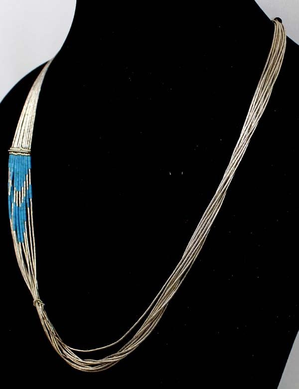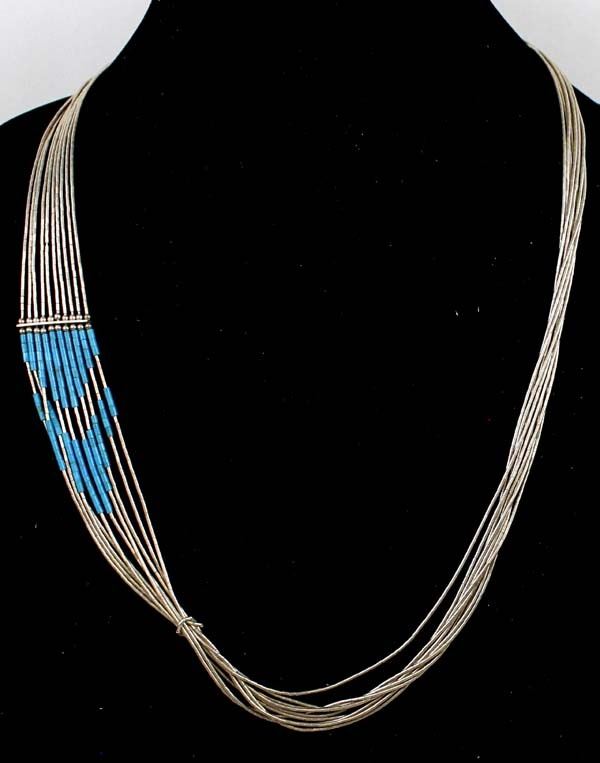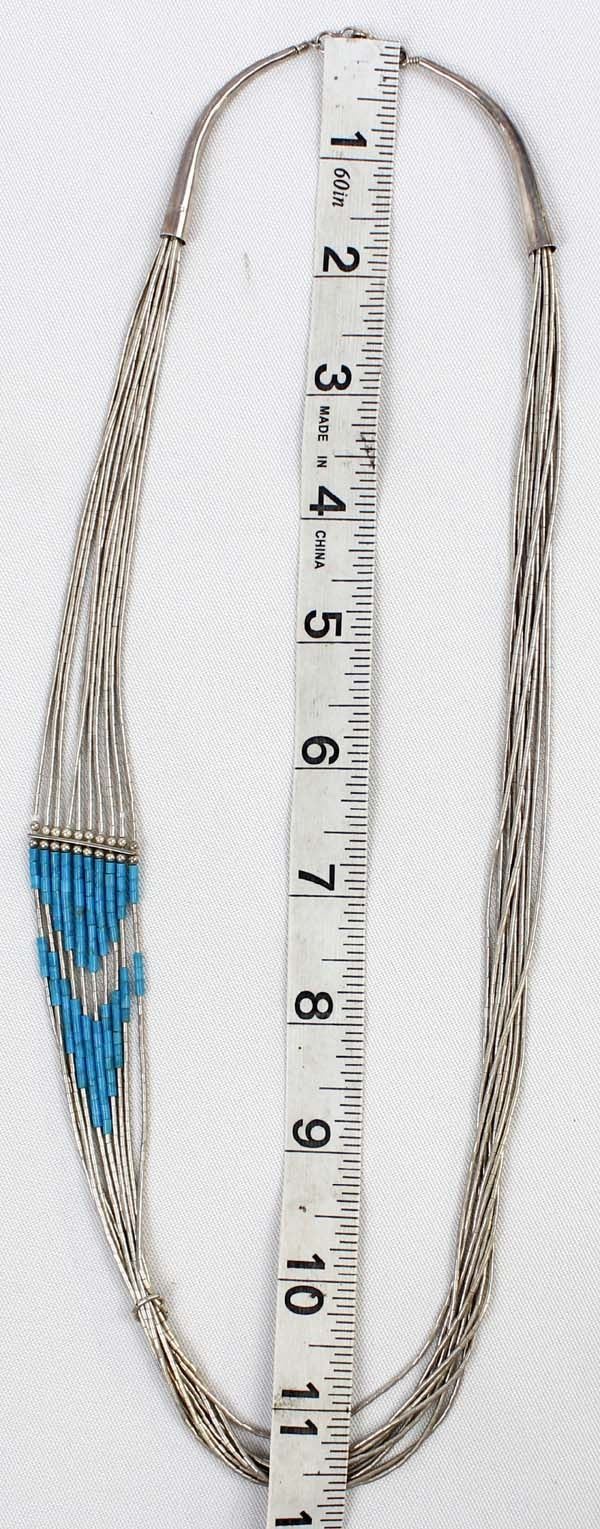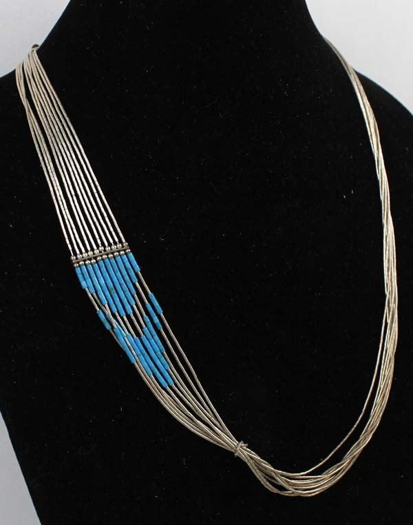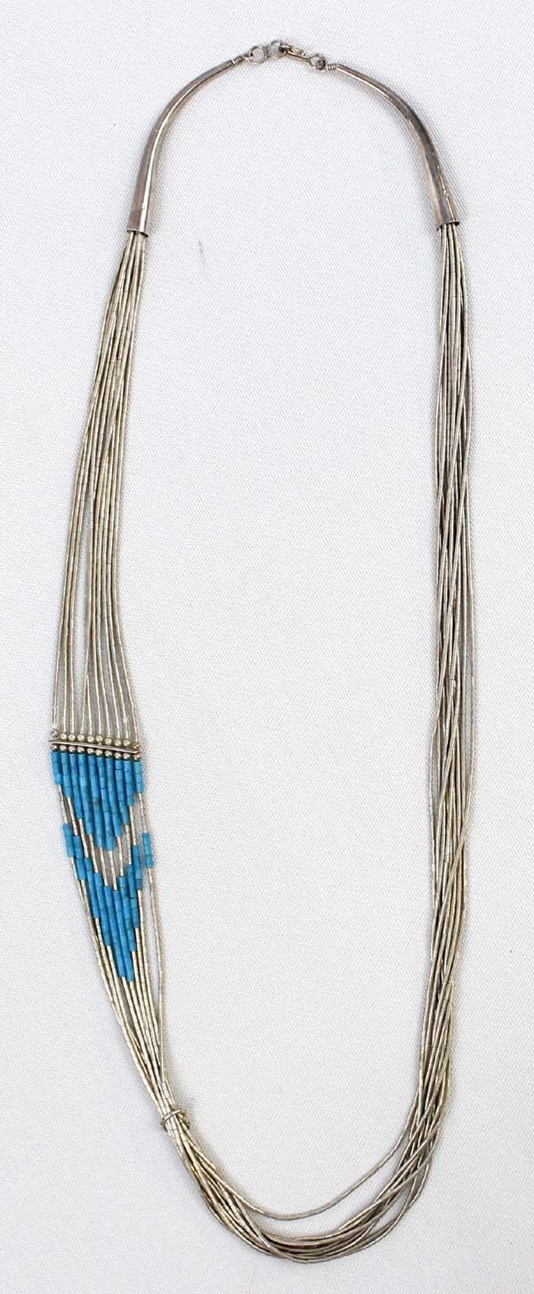 Native American Navajo Liquid Silver & Turquoise Bead Necklace, measures 26''L x 1'', sterling cones and clasp, cones are stamped sterling and hallmarked with a feather