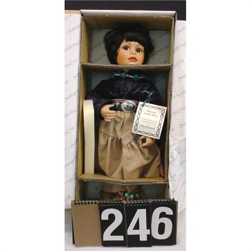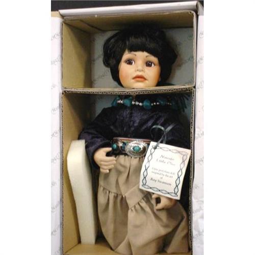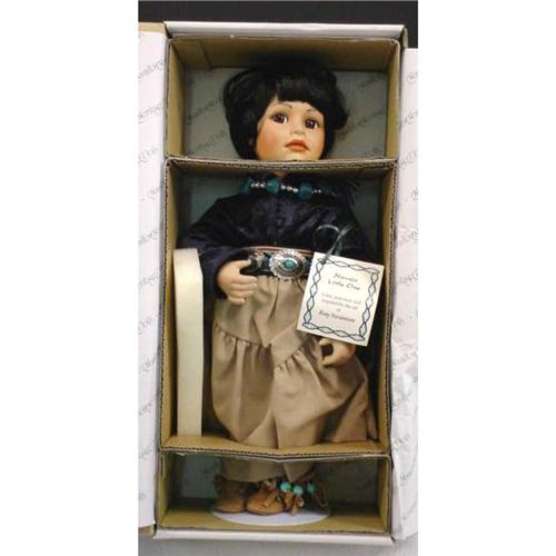 Heritage Dolls; The Hamilton Collection. "Navajo Little One" 1992. Inspired by the art of Ray Swanson. 15 inches tall. Prcelain head, hands and feet in original box and mint condition. Box measures 16" x 8" x 5" and weighs