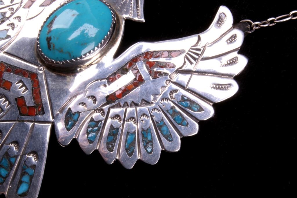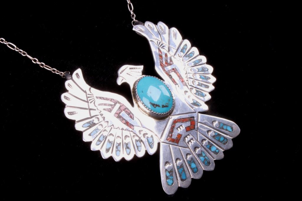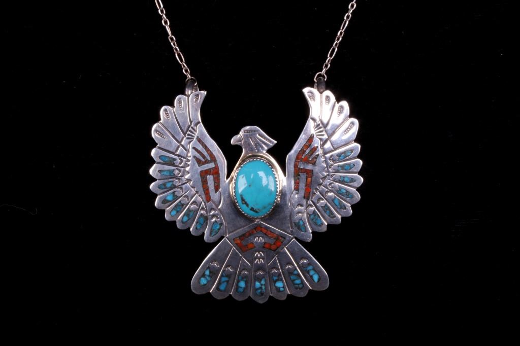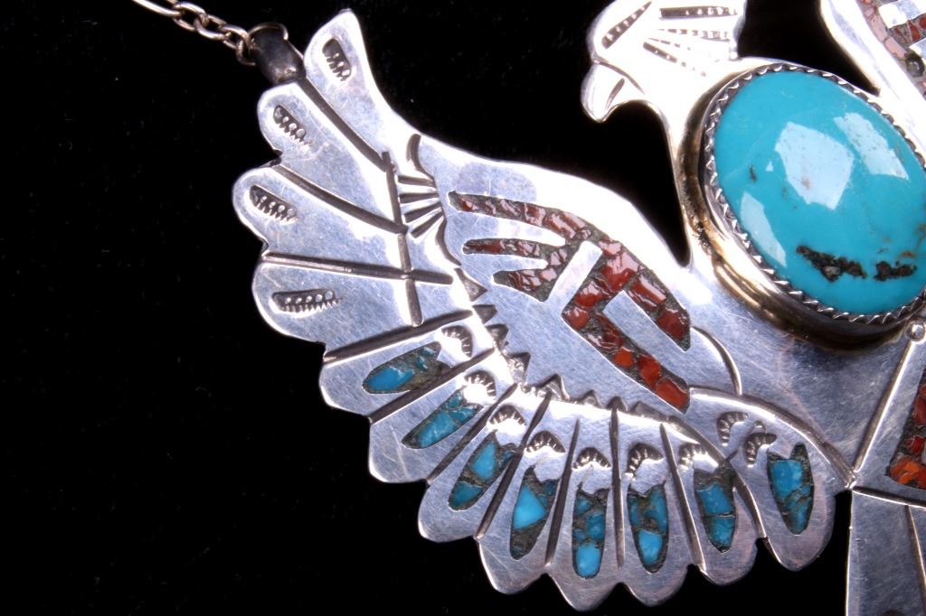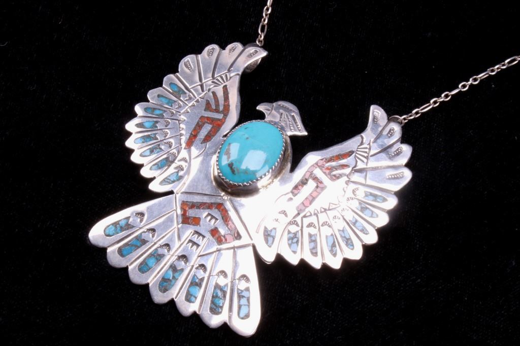 For your consideration is a Navajo Native American chip-inlay, sterling silver thunderbird necklace. The chip inlay technique became popular due to Tommy Singer, a renowned Navajo silversmith. The pendant on this piece showcases a lovely Lone Mountain turquoise polished cabochon, as well as chip inlaid branch coral and turquoise. The pendant is in the shape of a Thunderbird and features incredible detail in the wings and body. The back of the Thunderbird is stamped with the artist’s hallmark and “Sterling”. The Thunderbird chip inlay design has grown in popularity since the mid 1900’s. Musicians like Johnny Cash have worn this style. The necklace measures 18” when unclasped and the pendant measures 3” x 3”.
