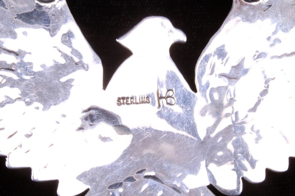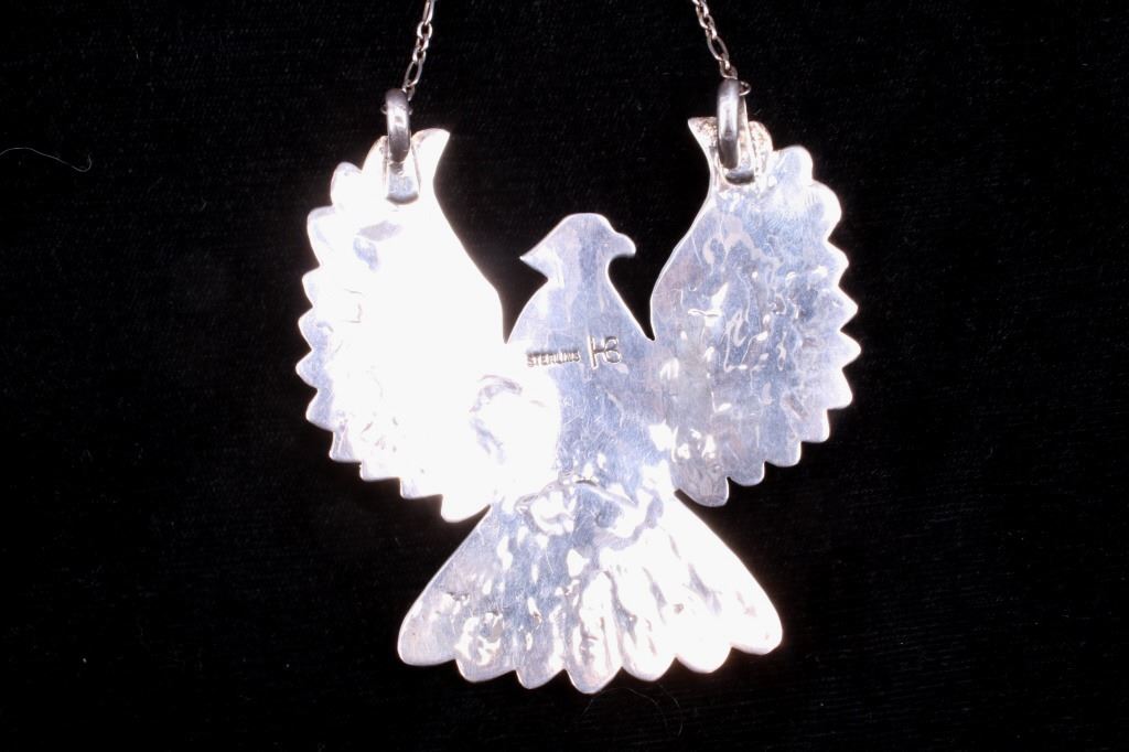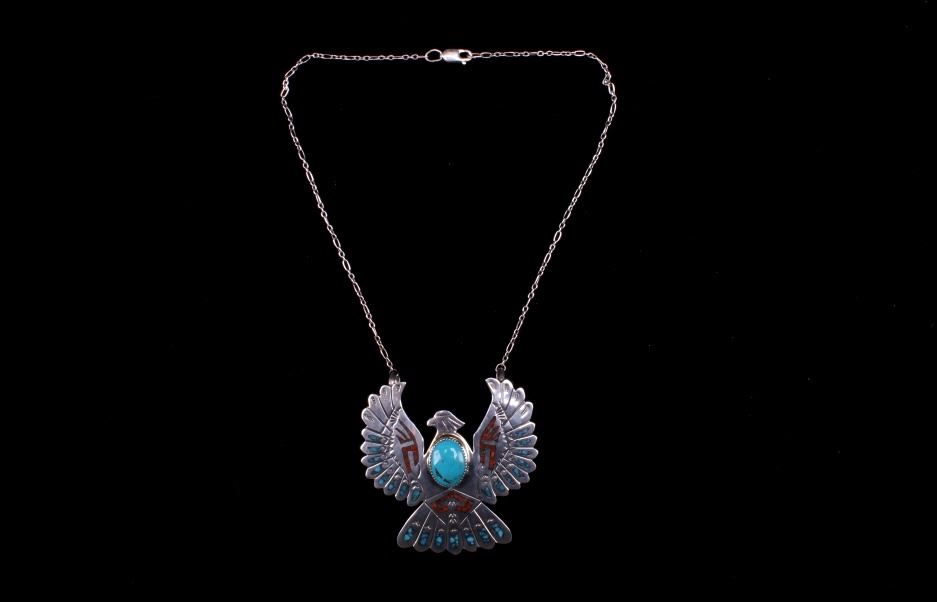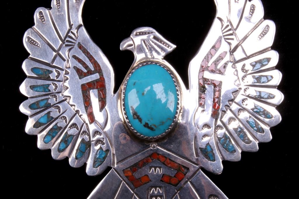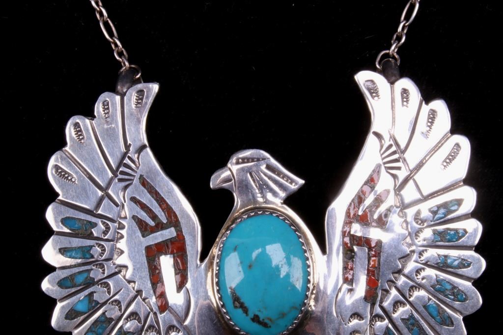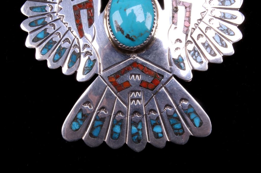 For your consideration is a Navajo Native American chip-inlay, sterling silver thunderbird necklace. The chip inlay technique became popular due to Tommy Singer, a renowned Navajo silversmith. The pendant on this piece showcases a lovely Lone Mountain turquoise polished cabochon, as well as chip inlaid branch coral and turquoise. The pendant is in the shape of a Thunderbird and features incredible detail in the wings and body. The back of the Thunderbird is stamped with the artist’s hallmark and “Sterling”. The Thunderbird chip inlay design has grown in popularity since the mid 1900’s. Musicians like Johnny Cash have worn this style. The necklace measures 18” when unclasped and the pendant measures 3” x 3”.