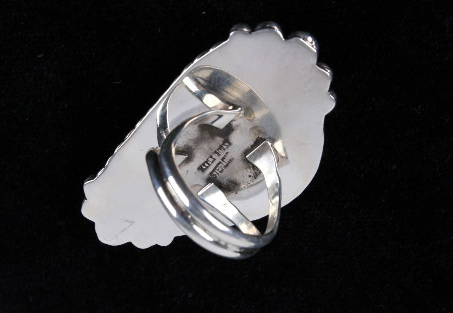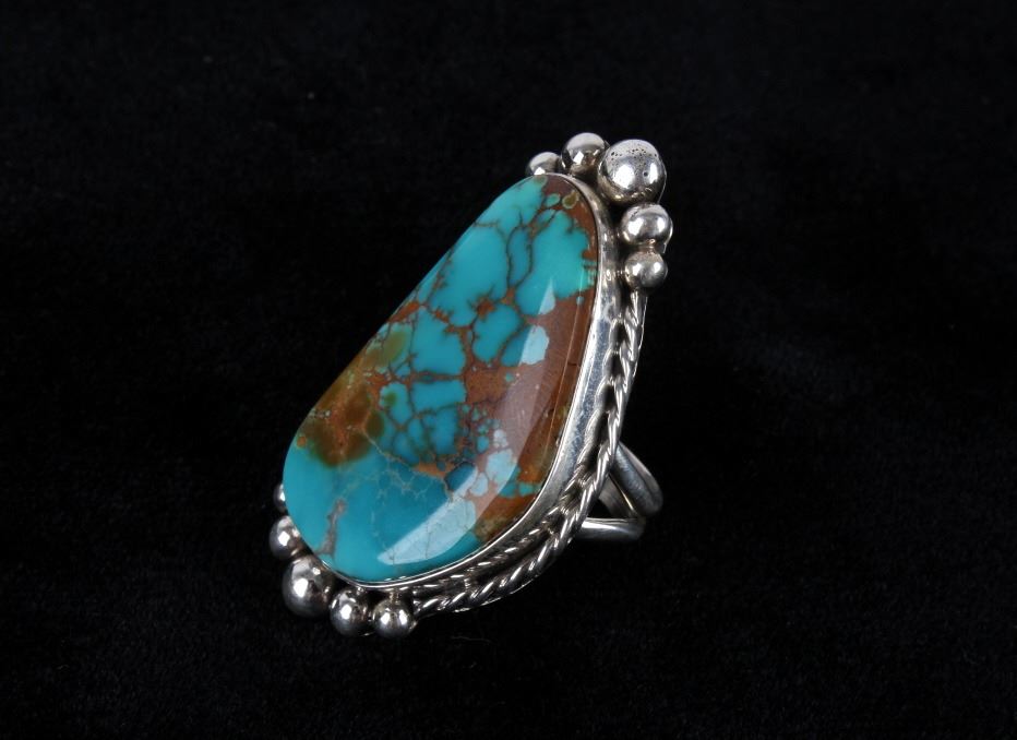 Included in this lot is a Navajo Native American Merle House Royston turquoise sterling silver ring. This dual banded ring features a large expertly cut and polished Royston turquoise polished cabochon. Royston turquoise is known for its beautiful colors ranging from deep forest green to rich, light blues set off by a heavy, brown matrix.. The cabochon is accented by a twisted rope and beads. This gorgeous hand made Navajo ring measures a US size 8 ½” and is stamped on the back Merle House and marked Sterling.