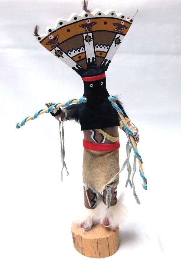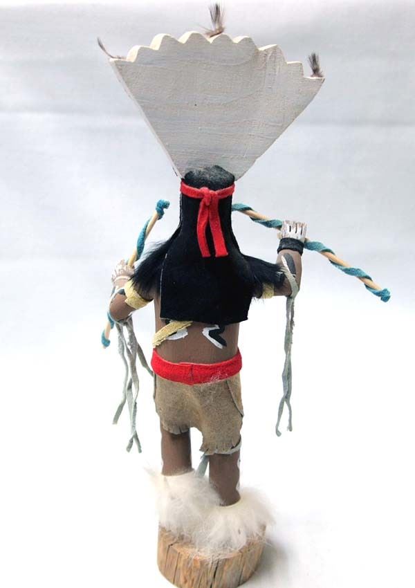 Nupp Estate: Native American Navajo Made Apache Gan Dancer Kachina by V. Garcia, measures 10.5''H x 5.5''W x 3''Deep and is signed by the artist, embellished with feathers, leather, and rabbit fur