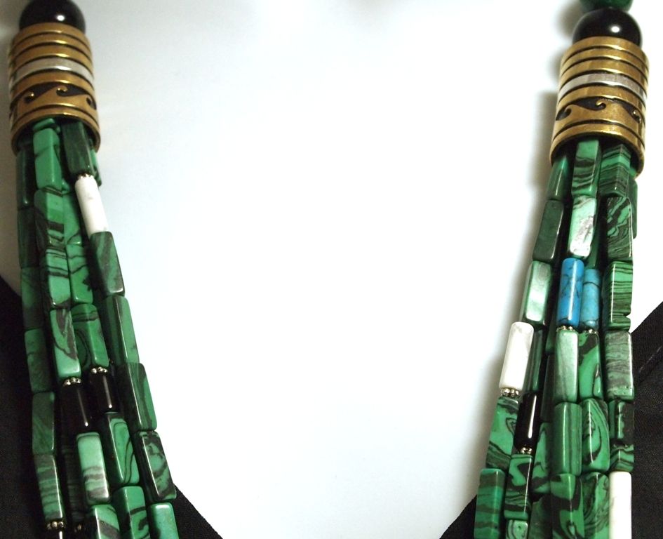 Measures 29" around by from 3/8" to 3/4" wide. Stones present: Malachite, 12k Gold Fill & Sterling Silver Beads, Howlite, Onyx, Turquoise.