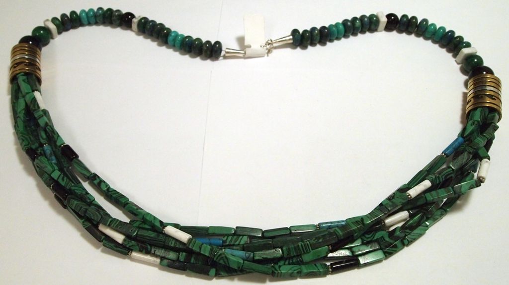 Measures 29" around by from 3/8" to 3/4" wide. Stones present: Malachite, 12k Gold Fill & Sterling Silver Beads, Howlite, Onyx, Turquoise.