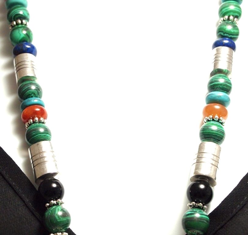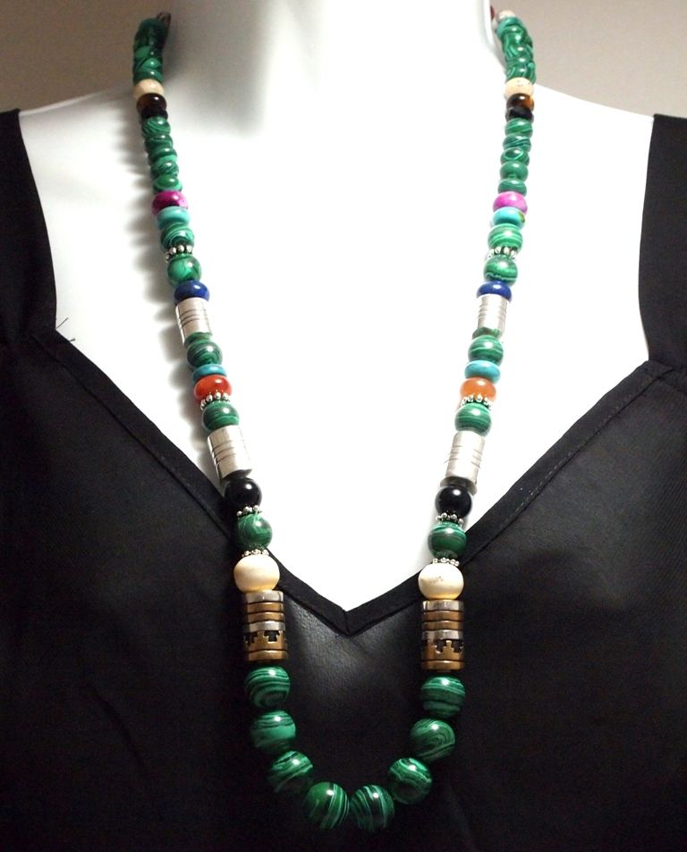 Measures 29" around by from 3/8" to 9/16" wide. Stones present: Malachite, 12k Gold Fill & Sterling Silver Beads, Lapis Lazuli, Sugilite, Coral, Turquoise, Onyx, Howlite.