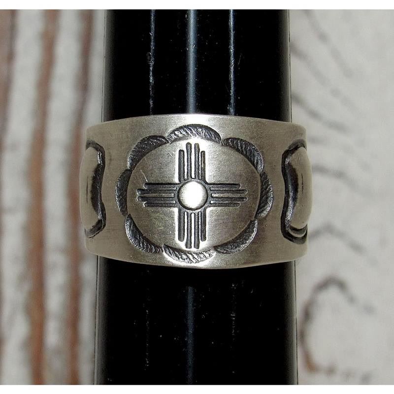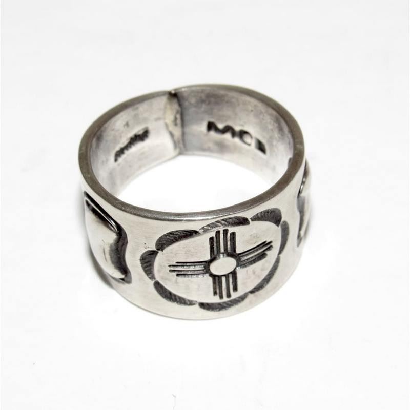 For your consideration is this stunning Native American Navajo sterling band ring in size 10 with hand etched Zia Cross design by the Navajo artist Martha Cayatineto. Marked sterling and is signed by the artist. The ring measures a little under 1" on the front at the widest point. Stamped sterling, hallmarked by the artist. Phenomenal example of collectible, wearable Native American art to add to any jewelry collection. FREE SHIPPING ON ALL JEWELRY ORDERS WITHIN THE US! WE SHIP ALL ITEMS IN-HOUSE!