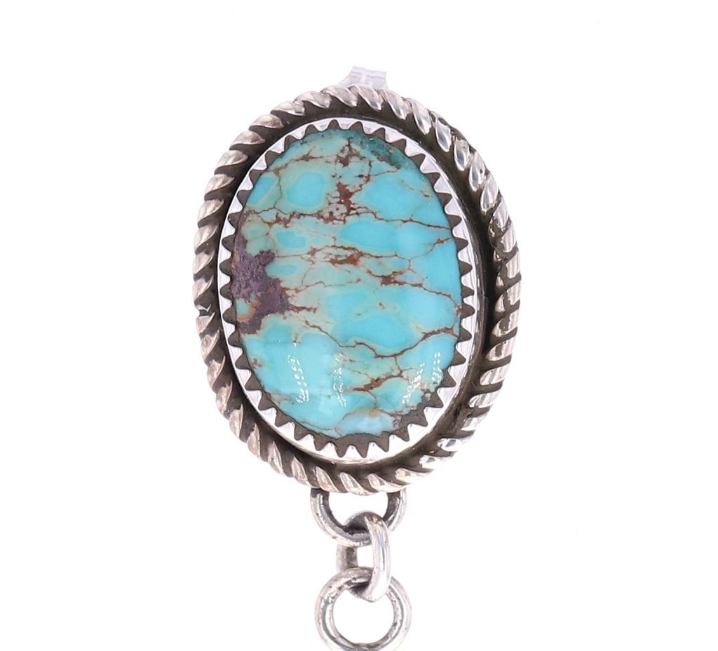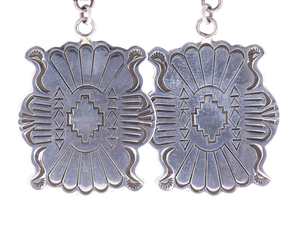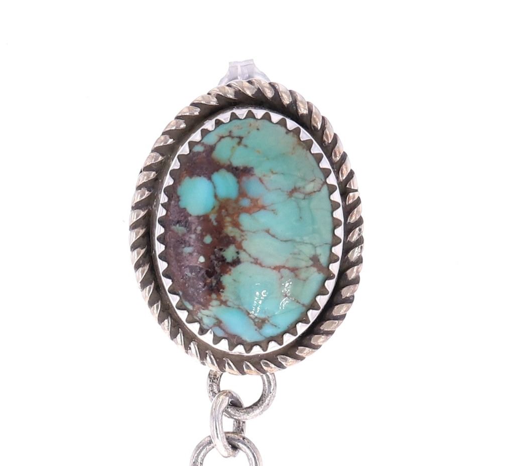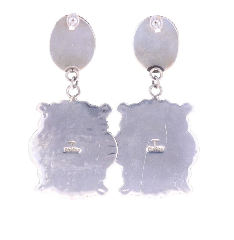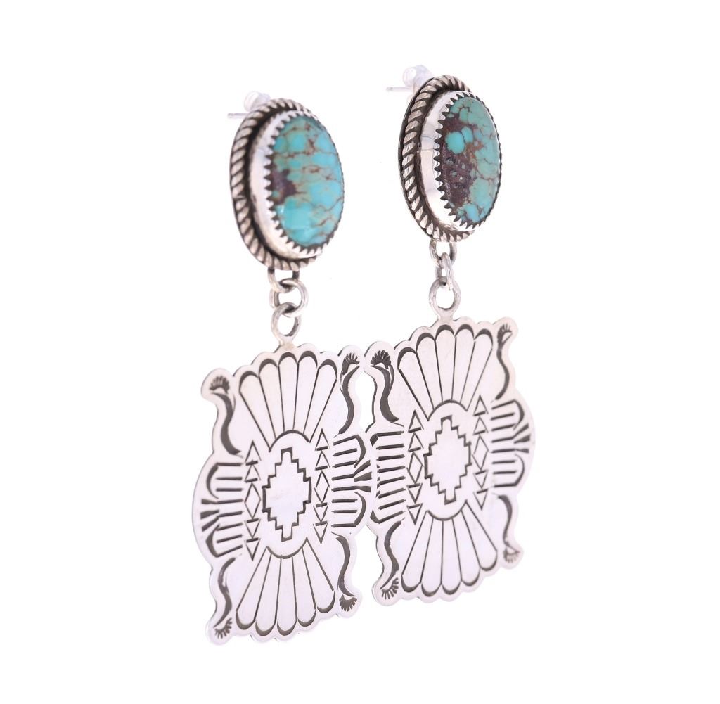 Featured in this lot is this pair of Navajo sterling and Kingman turquoise earrings made by Navajo silversmith Mary Thomas. The earrings exhibit a unique pattern with a large pendant design and amazing stamped Southwest designs. The top of the earrings showcase two oval cut cabochons of Kingman turquoise set in a rope style border showing colors of teal, green and brown. These are signed "T Sterling" from the renowned Mary Thomas, a Navajo silversmith born in 1944 and who died in 2017. The earrings show good condition with no signs of wear or obvious damage present. The earrings measure 2 1/2" L x 1 1/4" W. The Kingman turquoise cabochons measure 5/8" L x 7/16" W. The collective weight of the earrings is 18.9 grams.