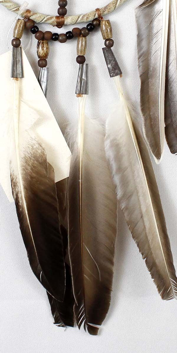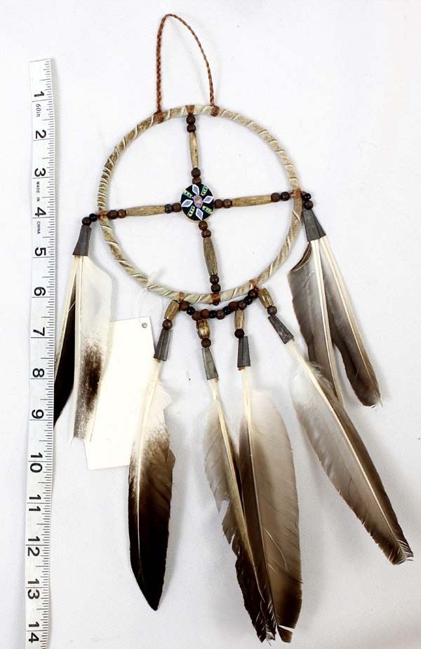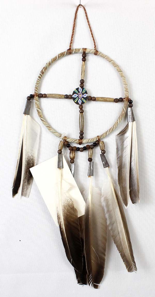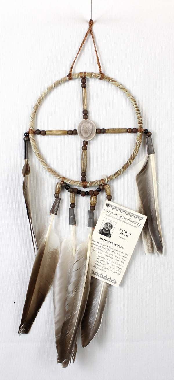 Native American Navajo Medicine Wheel by Nathan Bond, measures 13''L, embellished with feathers, beads, leather wrapped wheel, flattened tin cones, and painted antler disk, The medicine wheel represents the delicate circle of life.