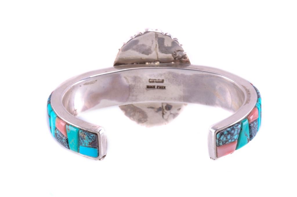 Featured in this lot is this sterling silver, Kingman Turquoise and multi stone inlaid bracelet from Navajo artist Merle House. The bracelet shows an extremely well-crafted inlaid design with a heavy example of sterling silver. The multi stone inlaid design shows specimens of turquoise, including Number 8, Cripple Creek, Sleeping Beauty, Kingman, and Morenci; the other stones included are a variety of shades of red branch coral and opalite. The bracelet shows the artist’s hallmark on the underside of the bracelet above a 'sterling' stamp. The condition of this bracelet is good, with no obvious signs of damage. The measurements of this bracelet are 2 3/8" x 2 7/8" x 1 5/8" with a circumference of 4 5/8". The total weight of this bracelet is 66.9g.