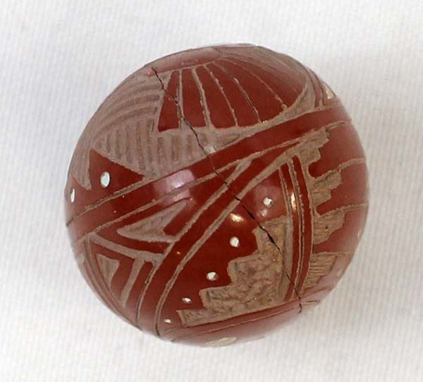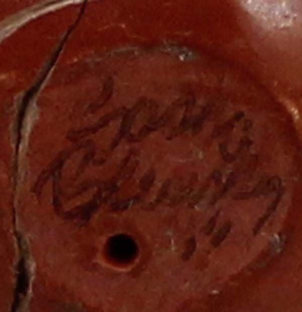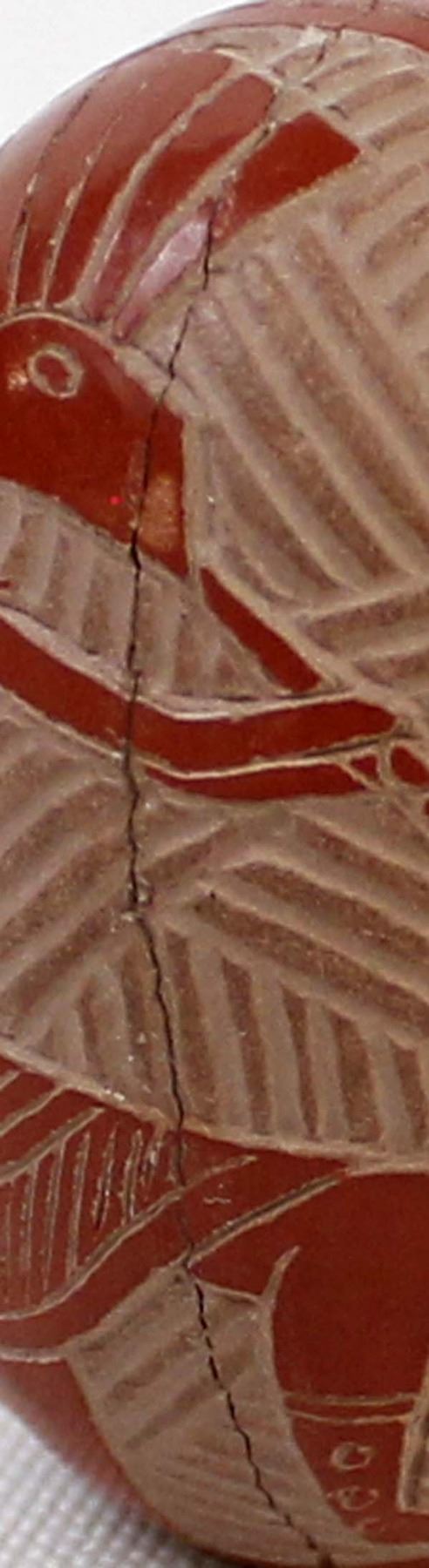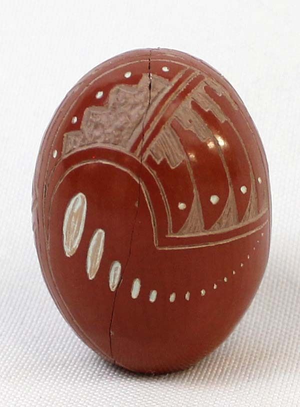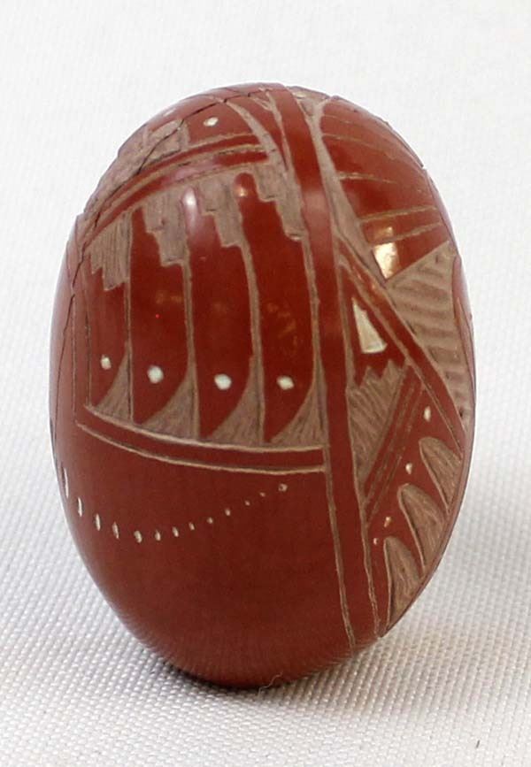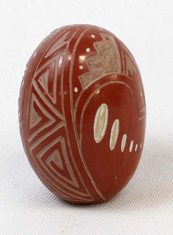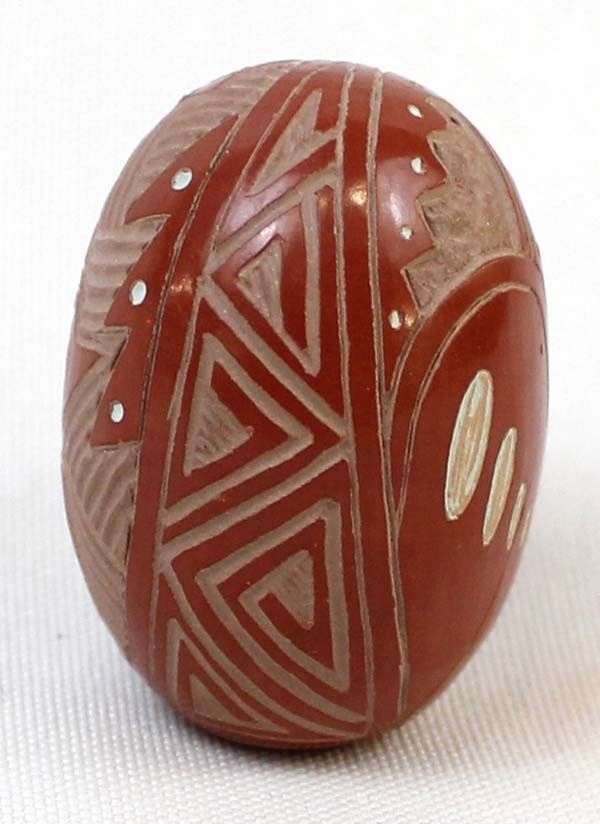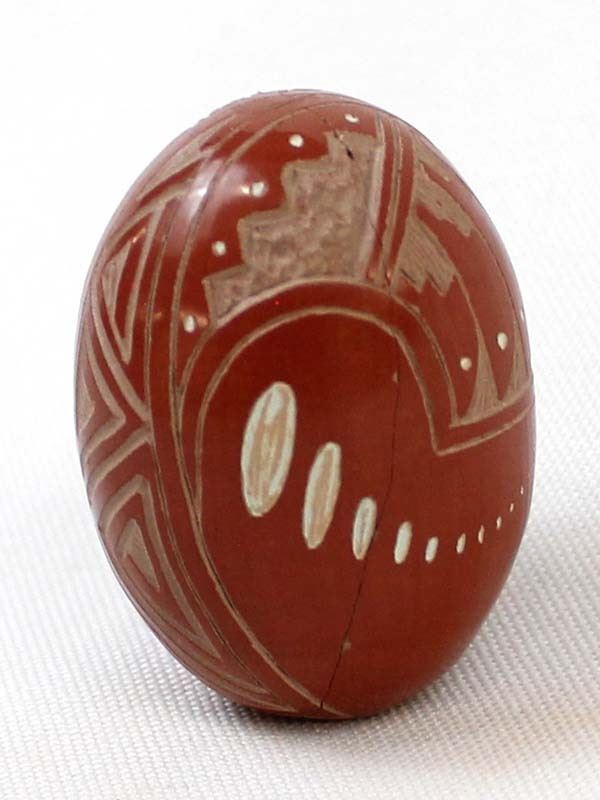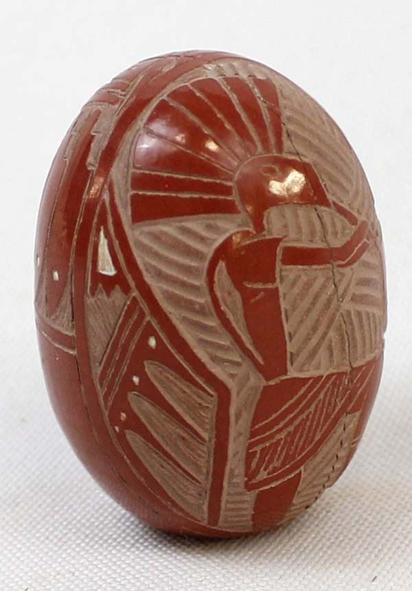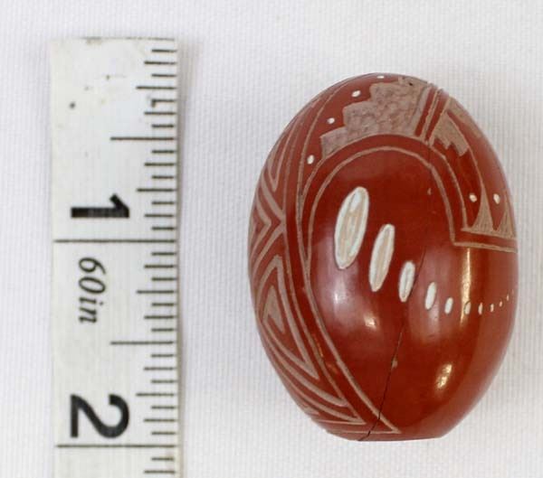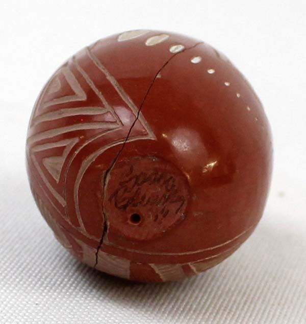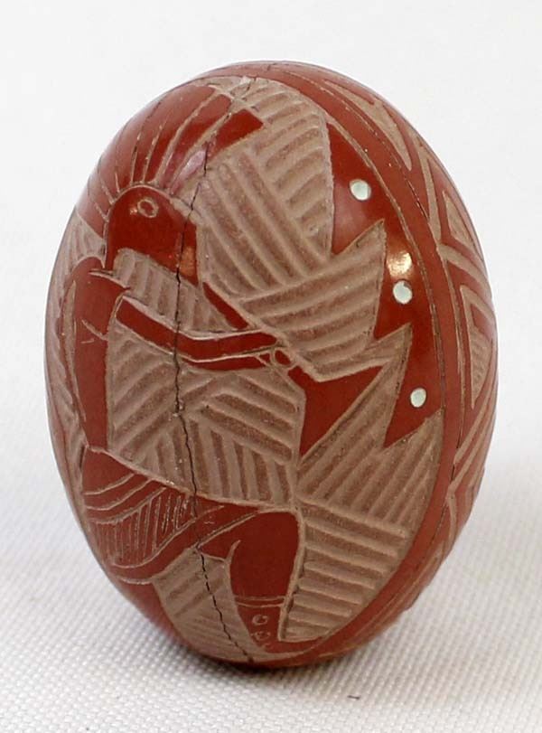 Native American Navajo Miniature Carved Pottery Jar by Sasha Bluesky, measures 1'' x 1.5'' and is signed on the bottom, there is a crack running completely around the piece which has been glued, beautifully carved geometric lines and designs along with a Kokopelli, very intricate carving, FYI: ''Sasha Bluesky was born in 1972 into the Navajo Nation. Sasha grew up with solid Southwestern traditions and many different styles of art. Sasha specializes in handmade stone polished, hand carved and hand painted miniature clay art. He signs his pottery as: Sasha Bluesky, Navajo. He is the son of Whirling Wind.''