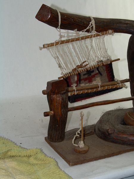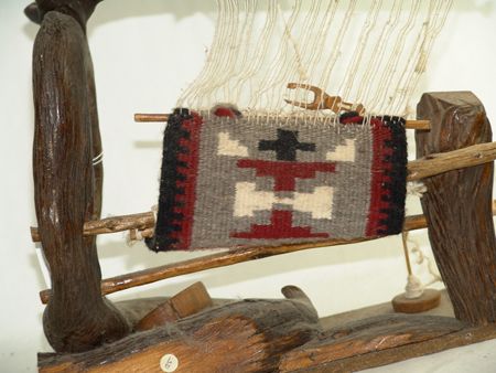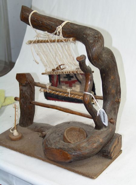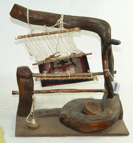 Ca. 1960s, Great 1960s example of a Navajo weaver's loom with  a nice rug start on it, done in miniature form,  made by Raymond Jones.  Good condition, dusty and  needs some adjusting.  Ex. McGee Collection. 14-1/2" x 14-1/2" x 9"
