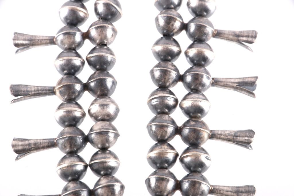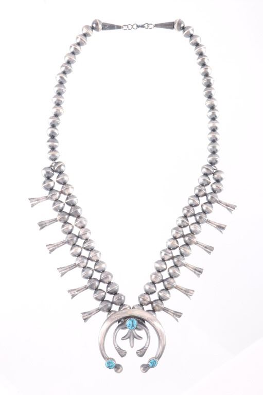 Featured in this lot is this sterling silver and Kingman turquoise squash blossom necklace from Navajo artist Gerald Mitchell. This is a beautifully and professionally handmade squash blossom necklace with 12 blossoms on the double string, handmade sterling silver hollow beads, and a central sterling silver naga with three round cut Kingman turquoise cabochons set into the naga pendant. The artist’s hallmark can be seen on the backside of the naga pendant with a 'sterling' stamp next to the hallmark. The condition of this necklace is good, with no obvious signs of damage. The measurement of this necklace from clasp to clasp is 24" and the naga pendant measures 2" x 2 1/4"; the collective weight of this necklace is 117.5 g.