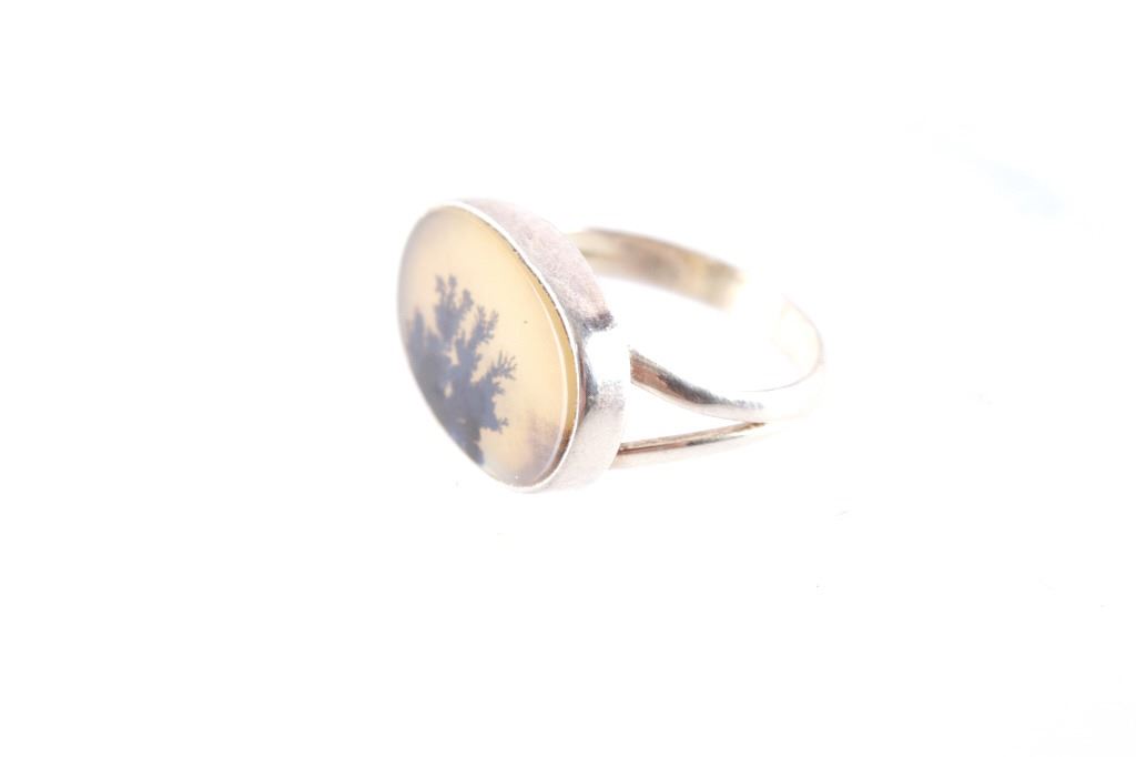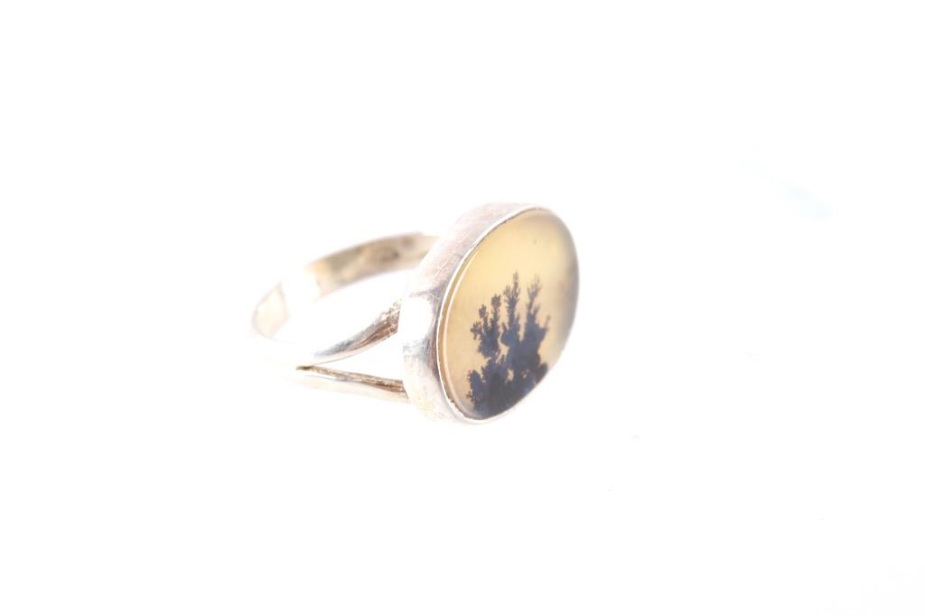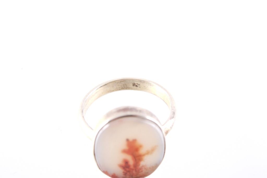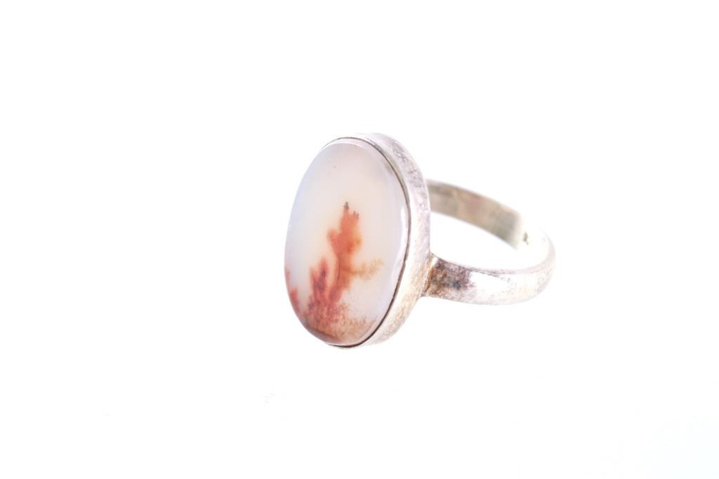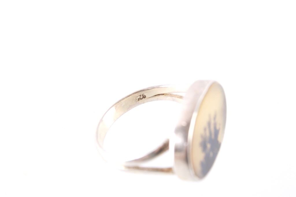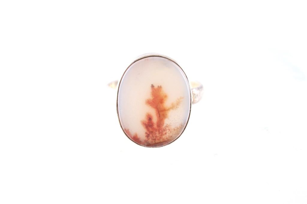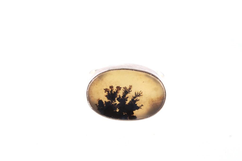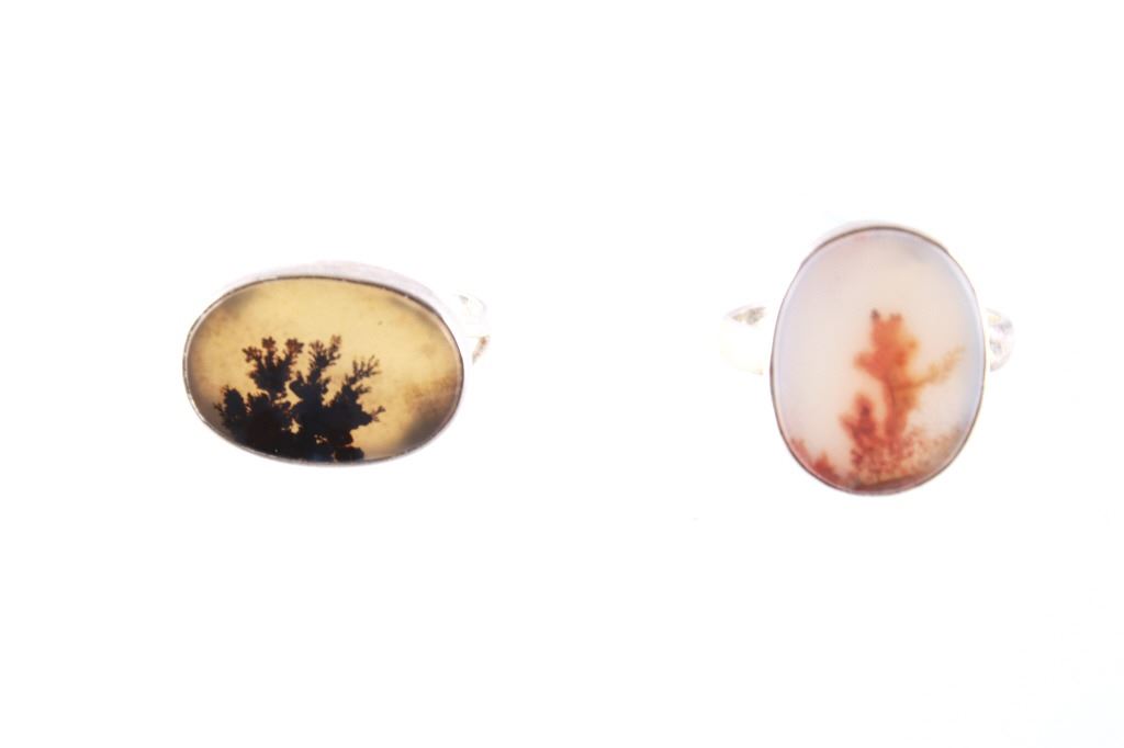 For your consideration in this lot are two Navajo made Montana dendritic agate sterling silver rings. The first ring has a horizontal oval of Montana dendritic agate on a split sterling silver band marked ‘925’. The black branch-like dendrite inclusions are made up of iron oxide or manganese. The "branches" in this ring look like the scrub sage of the Montana prairies. This ring is U.S. size 9.5. The next ring has a vertical oval of dendritic agate with red/brown branch-like dendrite inclusions of iron oxide or manganese. The "branches" in this ring resemble the fall colors of the cottonwoods. This ring is on a solid sterling silver band, U.S. size 9.5, marked ‘925’.